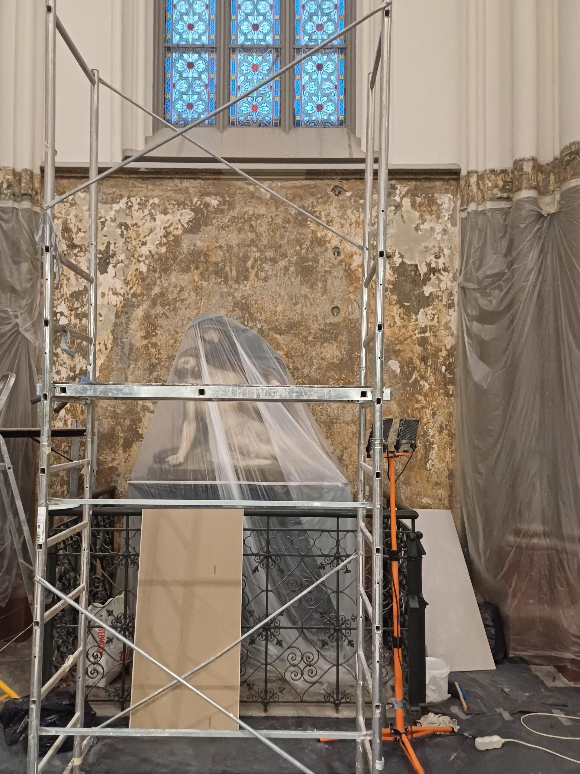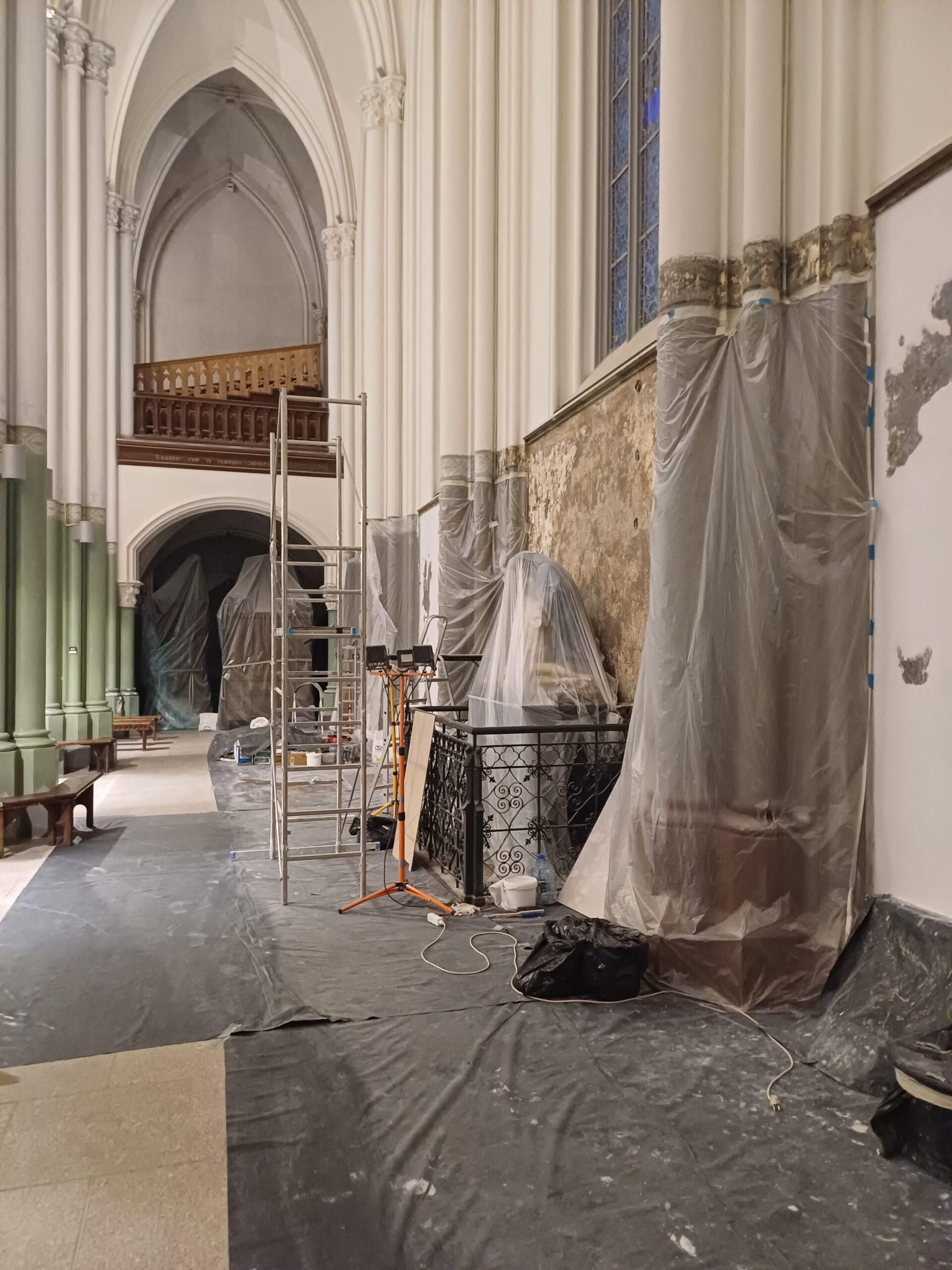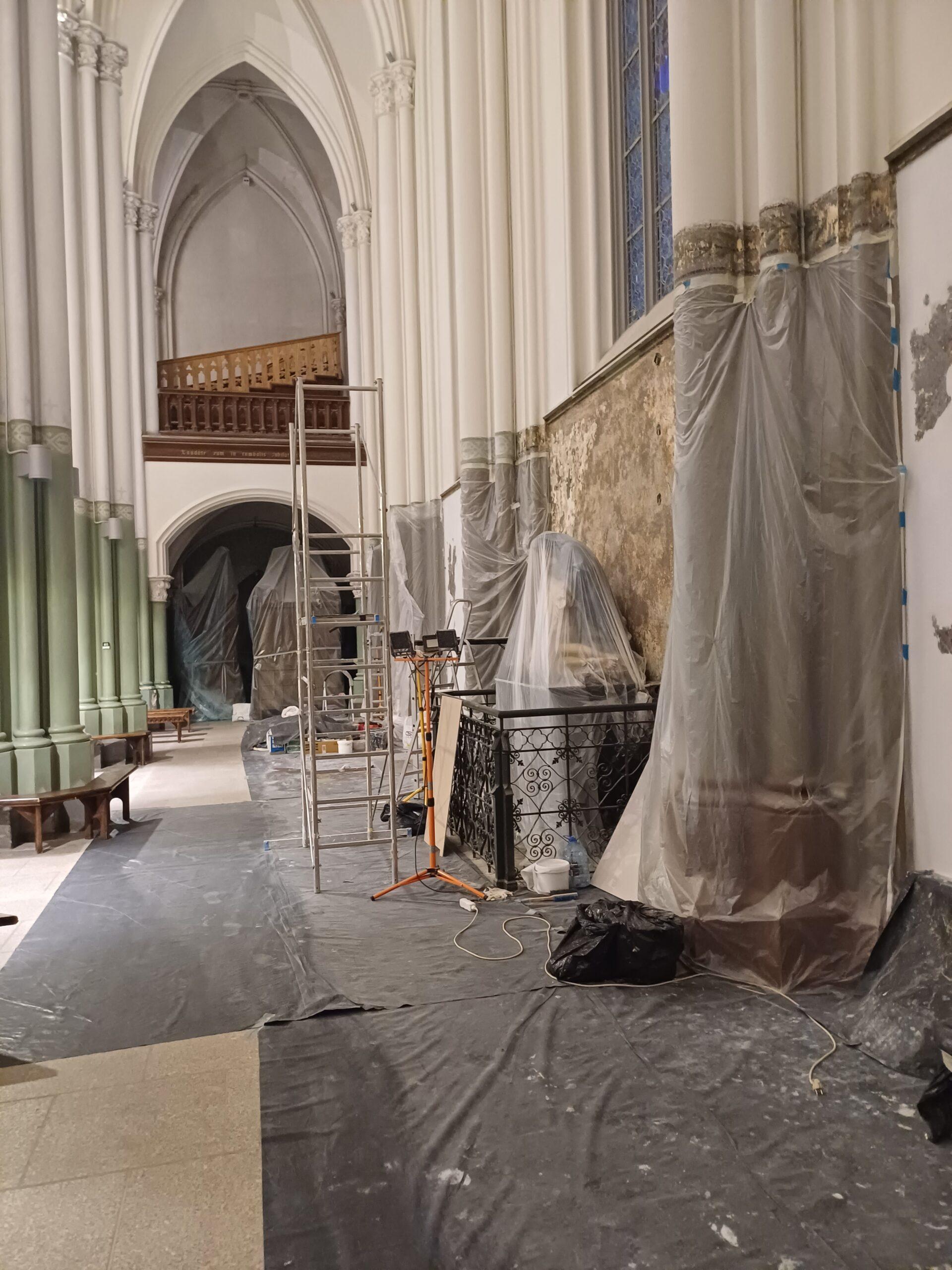 Visi darbai prasidėjo prieš COVID pandemiją ir pirmi planai buvo sutvarkyti bažnyčios vidų. Darbų pradžia užtruko per pandemiją. Į tvarkymo sąvoką įeina labai daug dalykų: ir restauravimas, ir išsaugojimas, ir mūsų pačių prisidėjimas – atnaujinam pačius svarbiausius liturginius dalykus, sako dekanas. Nuo presbiterijos buvo nuvalyti trys sluoksniai dažų, atidengtas originalusis sluoksnis, kuris ir buvo restauruojamas. Tos originalios dalies buvo išlikę tik fragmentai, todėl reikėjo ją atkurti tokią, kokia buvo pačioje pradžioje, kaip buvo sugalvota bažnyčios statytojų. Gal ir ne visiems prie širdies ta pilkšvai žalsva spalva, kuria dabar, kaip ir pačioje pradžioje, nudažytos centrinės navos kolonos ir presbiterija, bet atkurtas istorinis vaizdas.