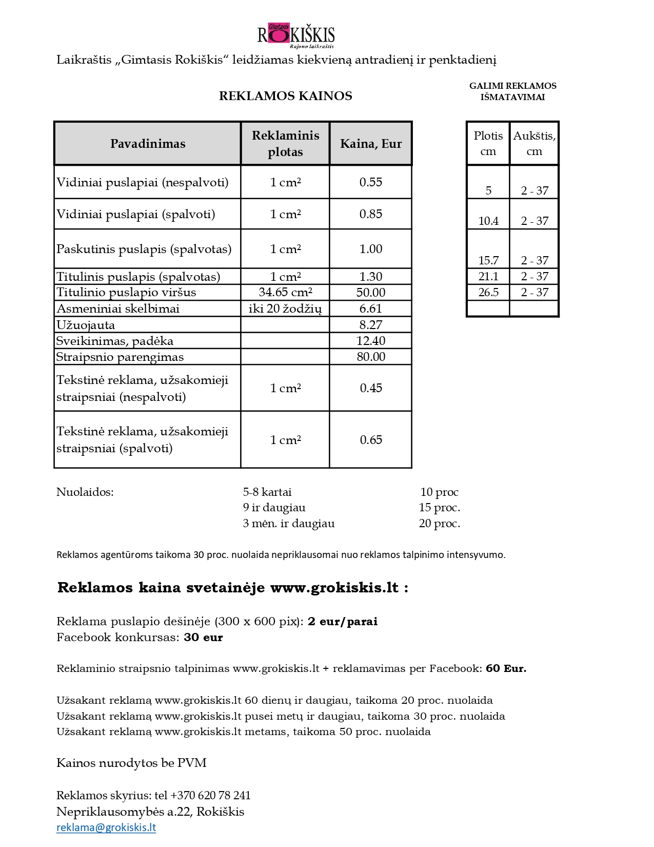 Reklamos laikraštyje bei tinklapyje įkainiai