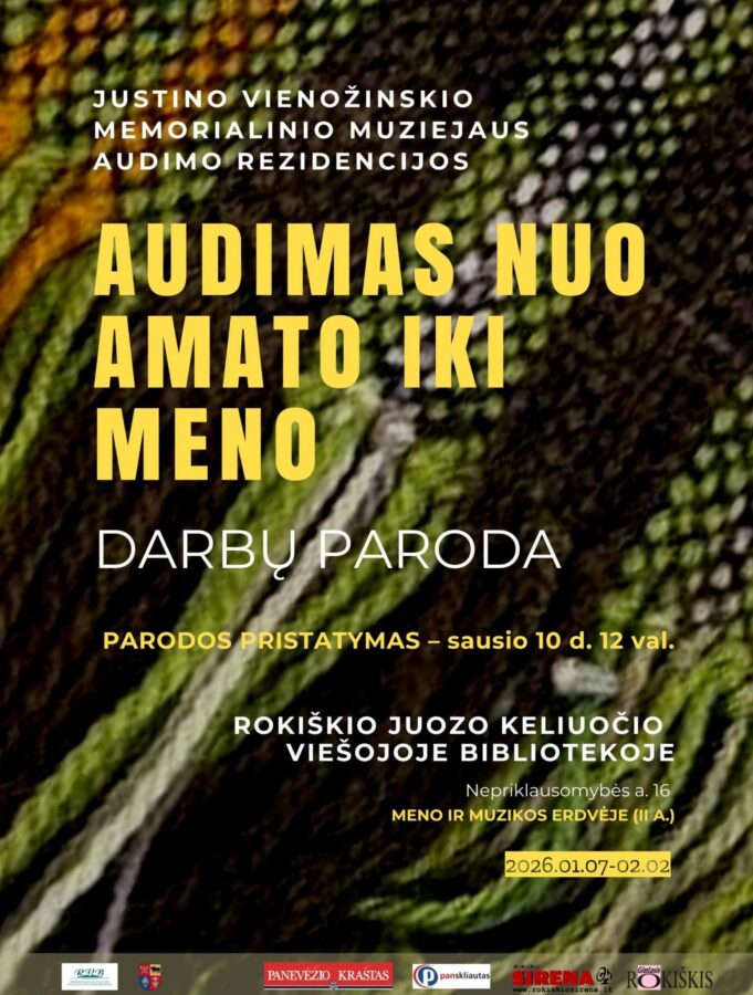 Sausio 10 d. 12 val. kviečiame į Justino Vienožinskio memorialinio muziejaus audimo rezidencijos „Audimas nuo amato iki meno“ darbų parodos pristatymą Rokiškio rajono savivaldybės Juozo Keliuočio viešosios bibliotekos Meno ir muzikos erdvėje (II a.) (Nepriklausomybės a. 16).