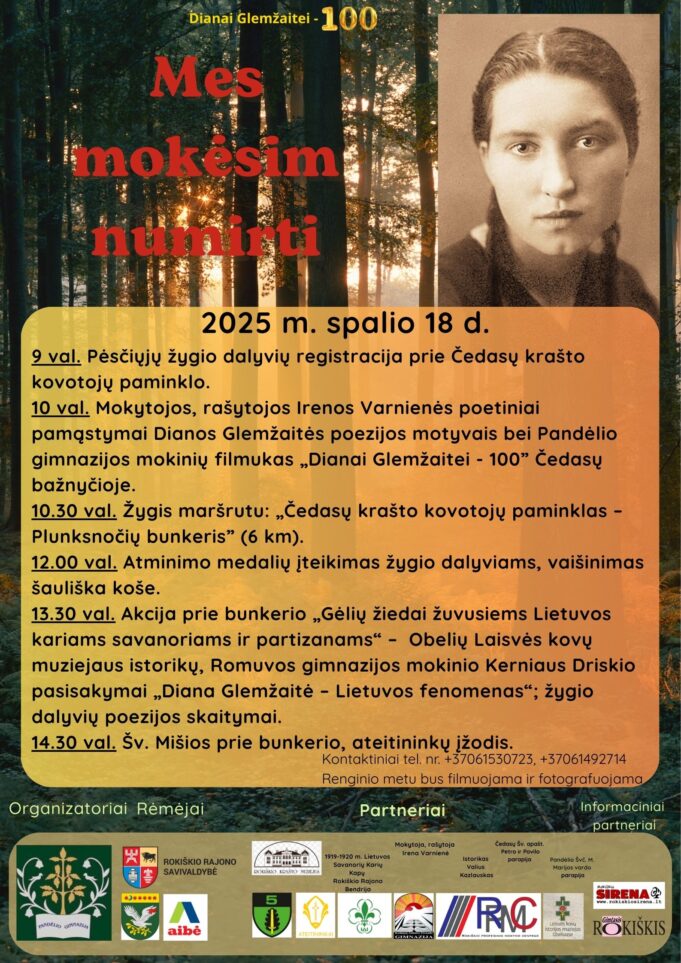 Spalio 18 d. Čedasuose Dianos Glemžaitės 100-mečio minėjimas MES MOKĖSIM NUMIRTI.