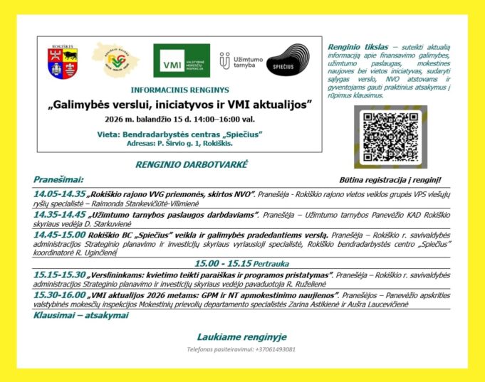 Renginio metu iš pirmų lūpų išgirsite apie Rokiškio rajono VVG paramą, Užimtumo tarnybos pagalbą darbdaviams, savivaldybės paramą verslui bei svarbias VMI naujienas dėl GPM ir nekilnojamojo turto apmokestinimo.