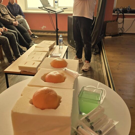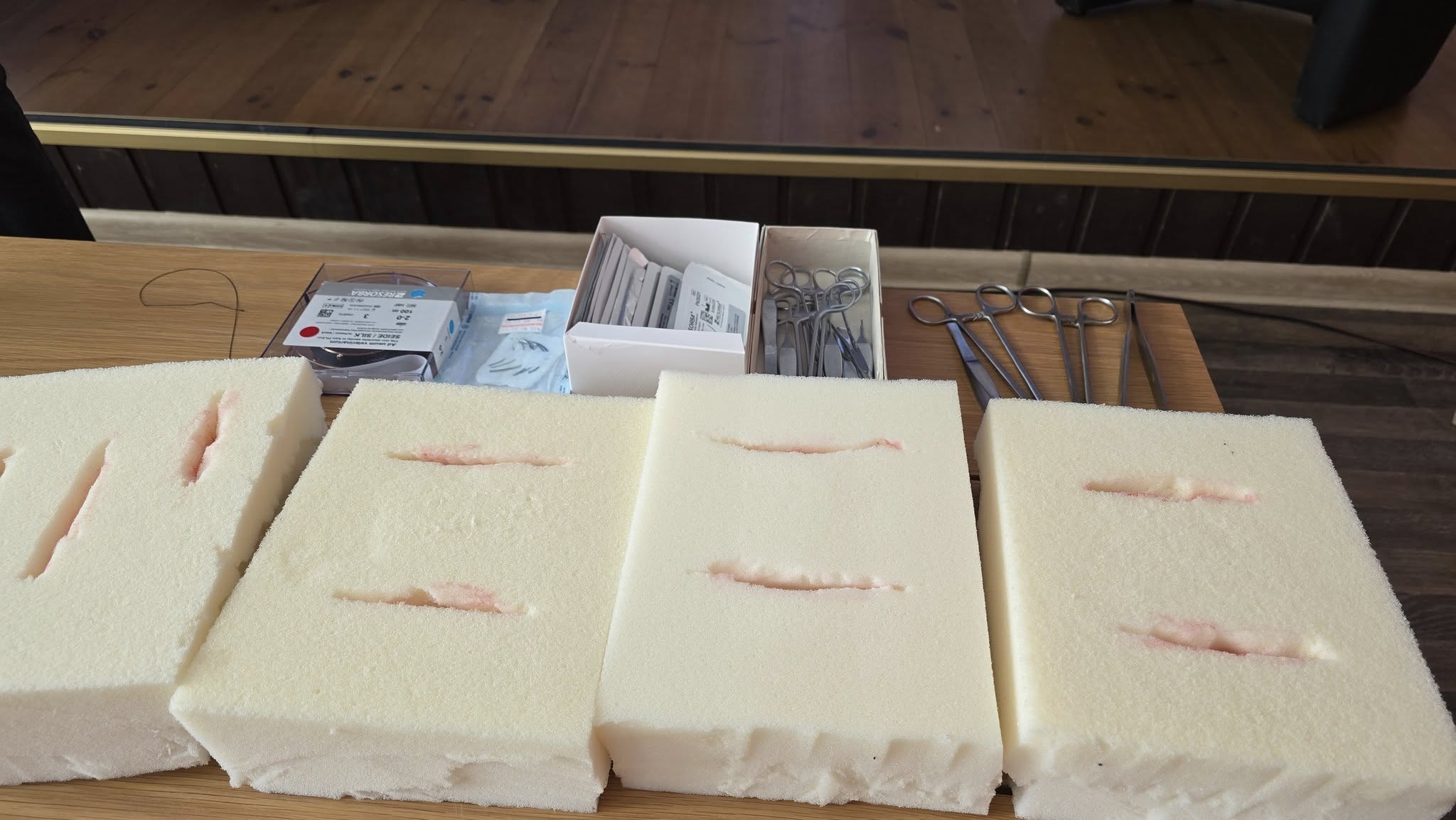 Praktinėje dalyje mokiniai galėjo patys išbandyti kai kuriuos chirurgo darbo elementus: siuvo „žaizdas“ naudodamiesi tikrais chirurginiais instrumentais, mokėsi leisti „vaistus“. Tai buvo proga savo rankomis bent šiek tiek patirti, ką reiškia būti gydytoju.