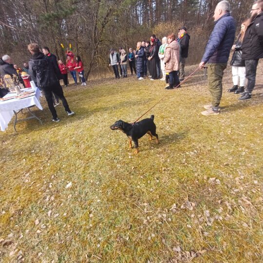 Privalgę vilutiškių košės ir pabendravę pasukome pro Dusetas link paskutinio kelionės sustojimo punkto. Netoli nuo Rokiškio ir Zarasų rajonų ribos, prie gražiai vėliavomis papuošto Velikuškių piliakalnio esančioje aikštelėje juodupiečius pasitiko Zarasų rajono Antazavės bendruomenės centro žmonės su centro pirmininke Danute Skardinskiene priešakyje. Prisisėdėję mašinose visi džiugiai užkopėme į aukštą piliakalnį, nuo kurio toli matyti, o ant jo visos nuotraukos gražesnės. Ir abu keliautojų šunys labai džiaugėsi tokiu kopimu aukštyn žemyn.
