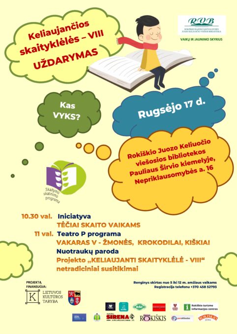 Rugsėjo 17 d. 11 val. – projekto „Keliaujanti skaityklėlė – VIII“ uždarymas. Teatro P programa „Vakaras V – Žmonės, krokodilai, kiškiai”, Pauliaus Širvio kiemelyje.