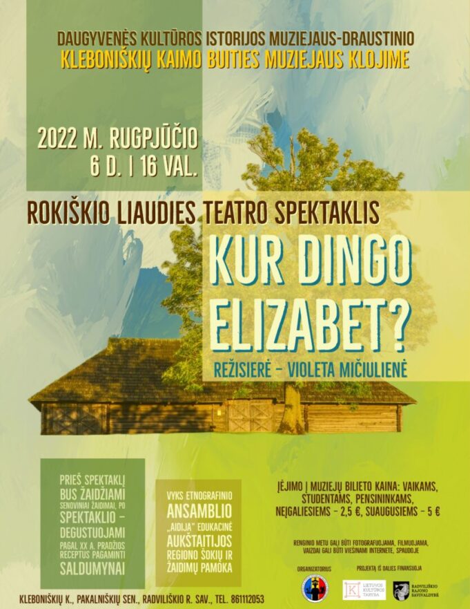 Rugpjūčio 6 dieną 16 valandą Daugyvenės kultūros istorijos muziejaus-draustinio Kleboniškių buities skyriaus (Radviliškio r.) klojime Rokiškio liaudies teatras žiūrovus įtrauks į kupiną intrigų ir painiavos detektyvą – vaidins spektaklį „Kur dingo Elizabet?“ (režisierė Violeta Mičiulienė).