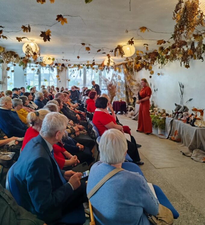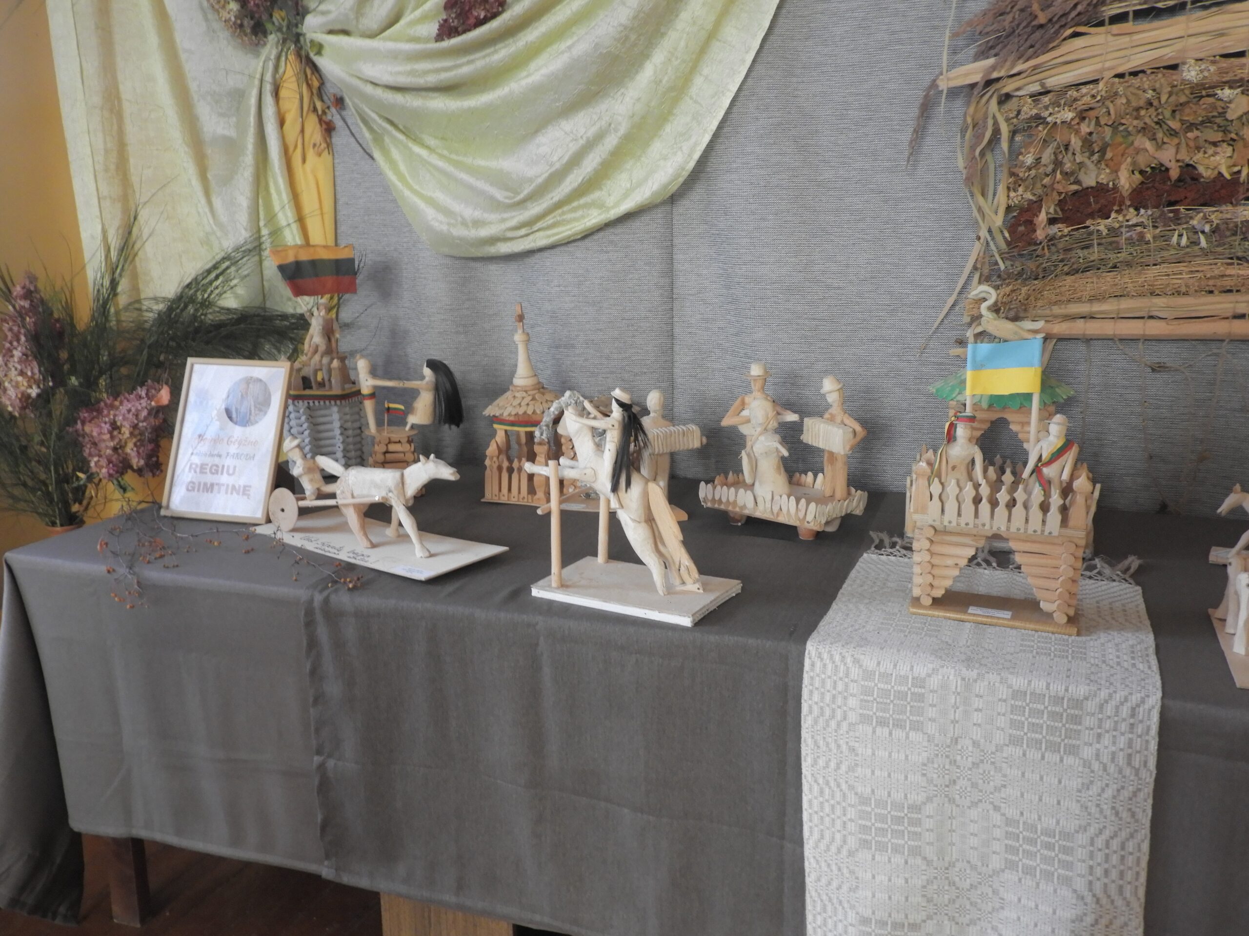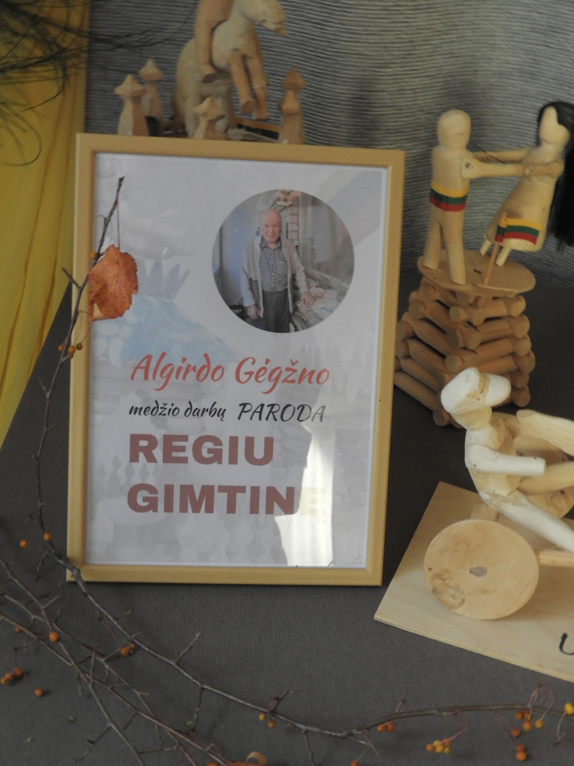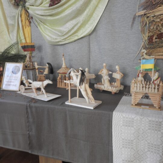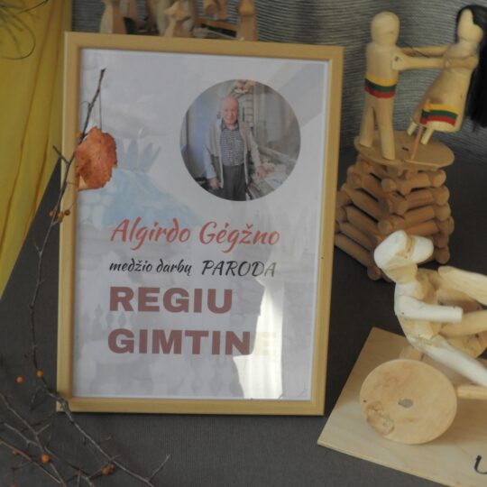 Štai ir praėjusį savaitgalį vykusios vakaronės „Po rudens darbų“ metu buvusios mokyklos pastate atidarytos net dvi parodos – Virginijos K. Knowles veltų miško žvėrelių, kuriems įkurdinti darbščios kriaunietės net ir mišką sukūrė, ir Algirdo Gėgžno, aklo medžio drožėjo iš Pasarčių kaimo, dabar gyvenančio Rokiškyje, medžio darbų.