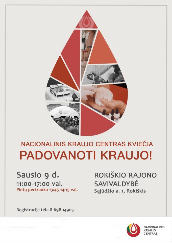 Sausio 9 d. Rokiškio rajono savivaldybėje (Sąjūdžio a. 1) Nacionalinis kraujo centras rengia kraujo donorystės akciją ir kviečia padovanoti kraujo.