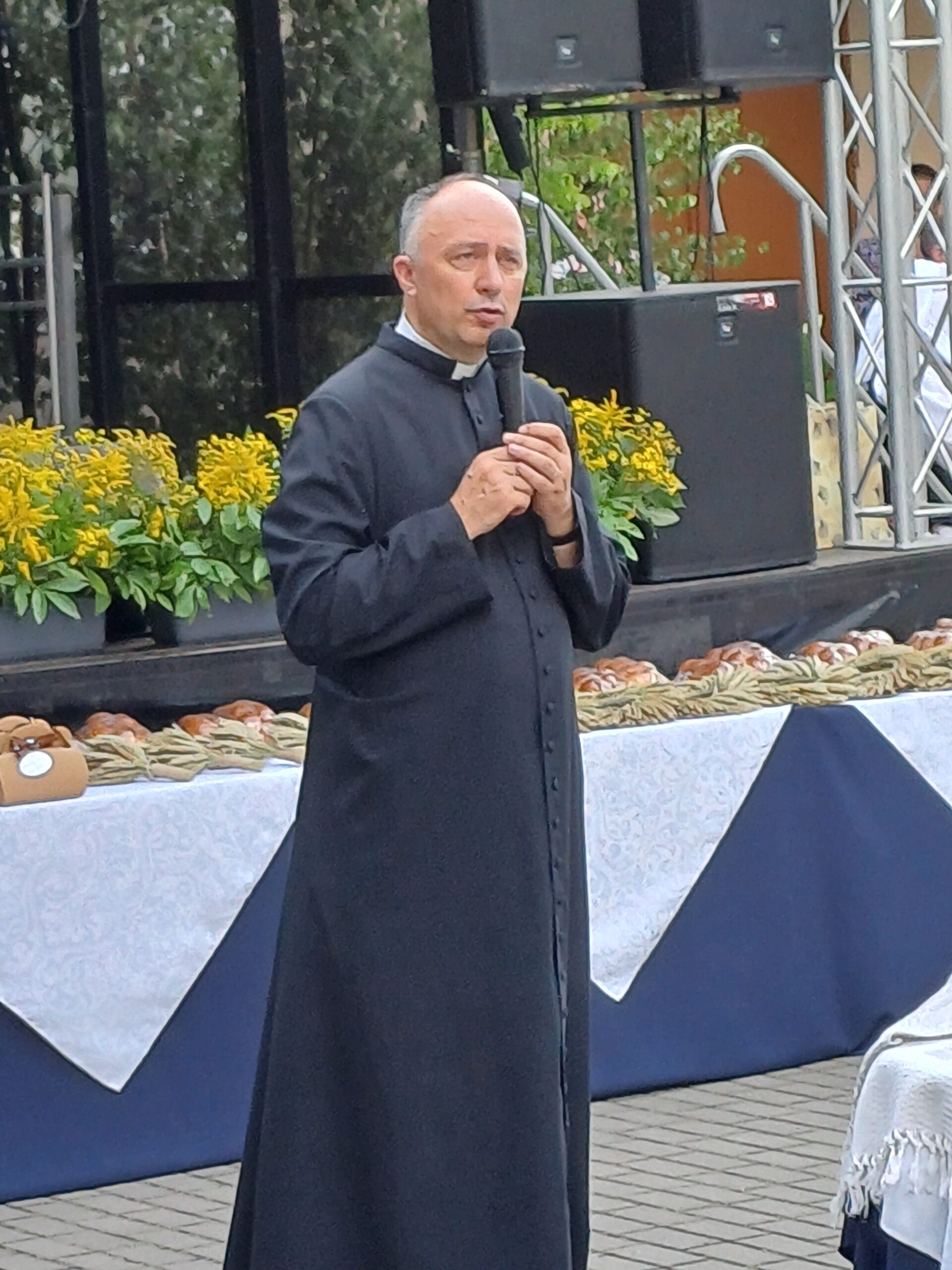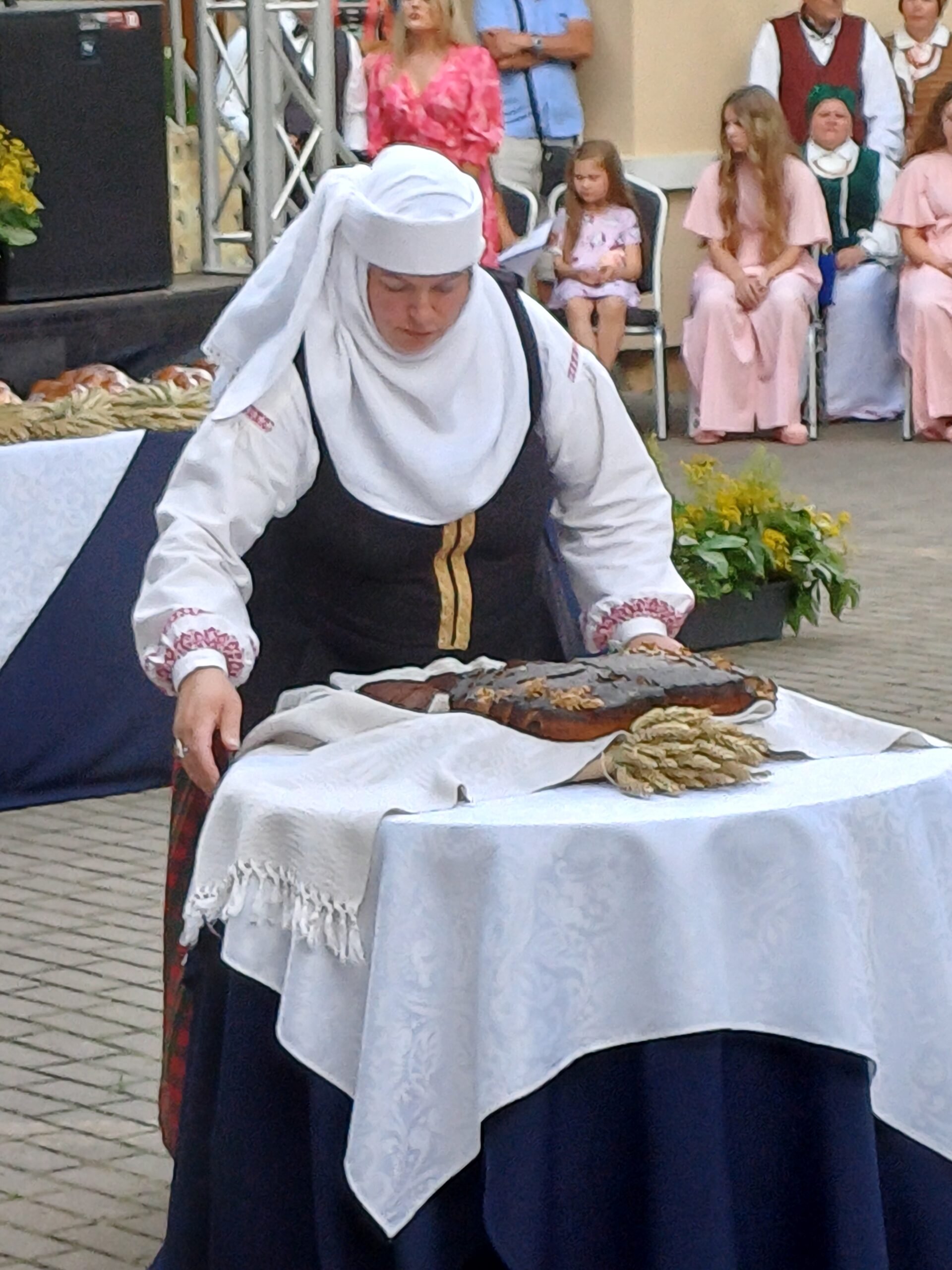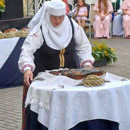 Pandėlio klebonas Albertas Kasperavičius ne tik palaimino naujo derliaus duoną, bet ir pasidalino ja su visais susirinkusiais bei pasveikino ir įteikė dovanas šių metų parapijietėmis pripažintoms Audronei Melvydienei ir Faustai Kutraitei.