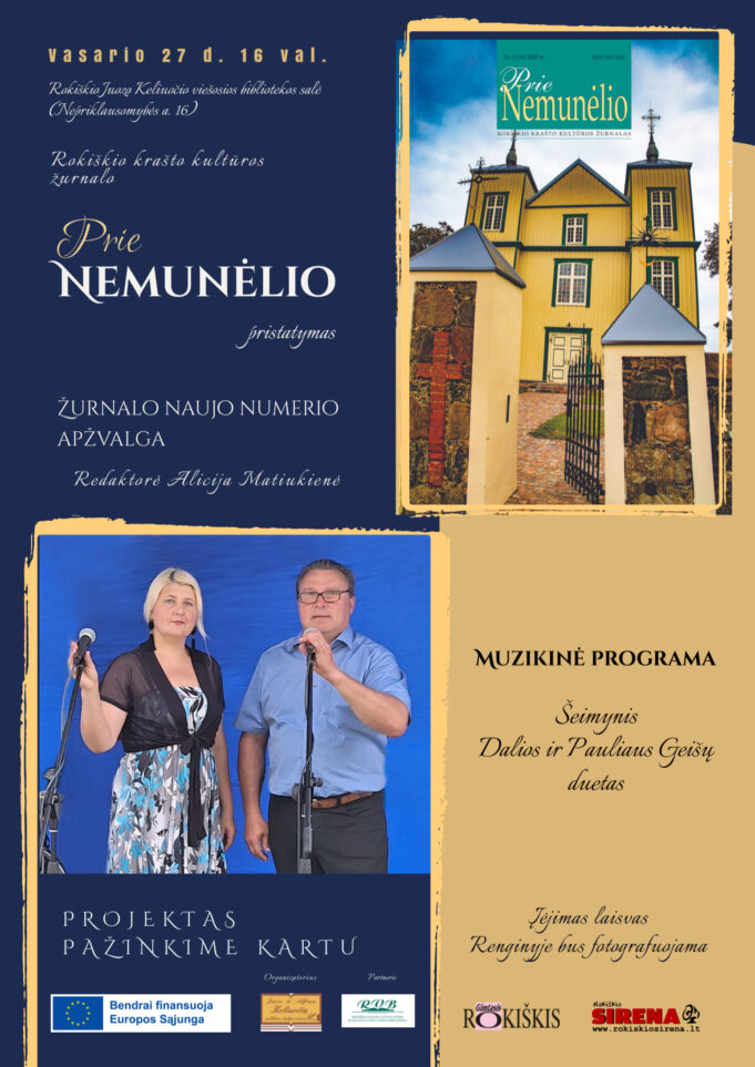 Vasario 27 d. 16 val. Rokiškio Juozo Keliuočio viešosios bibliotekos salėje (Nepriklausomybės a. 16) Rokiškio krašto kultūros žurnalo „Prie Nemunėlio“ pristatymas ir naujo numerio apžvalga.