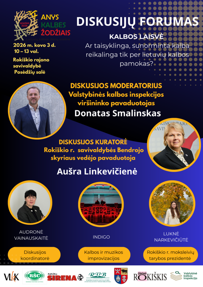 Kovo 3 d. 10–13 val. Rokiškio rajono savivaldybėje posėdžių salėje vyks moksleiviams skirtas diskusijų forumas „Kalbos laisvė“, kuriame bus svarstoma, ar taisyklinga, sunorminta kalba reikalinga tik per lietuvių kalbos pamokas. Diskusiją moderuos Valstybinės kalbos inspekcijos viršininko pavaduotojas Donatas Smalinskas.