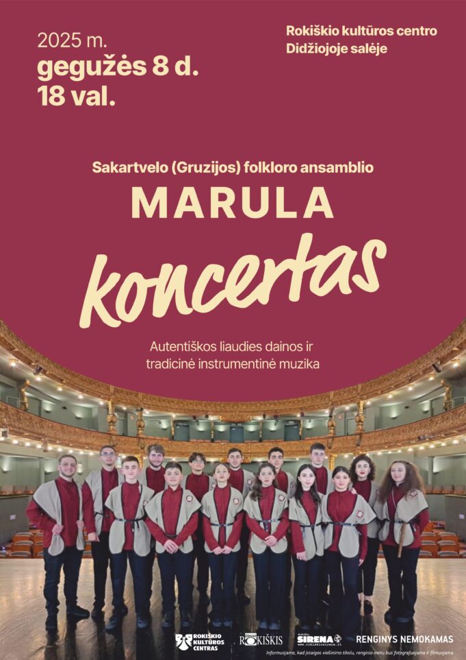 Gegužės 8 dieną 18 valandą Rokiškio kultūros centre Sakartvelo folkloro ansamblis „Marula“ pristatys savo kūrybą ir mums.