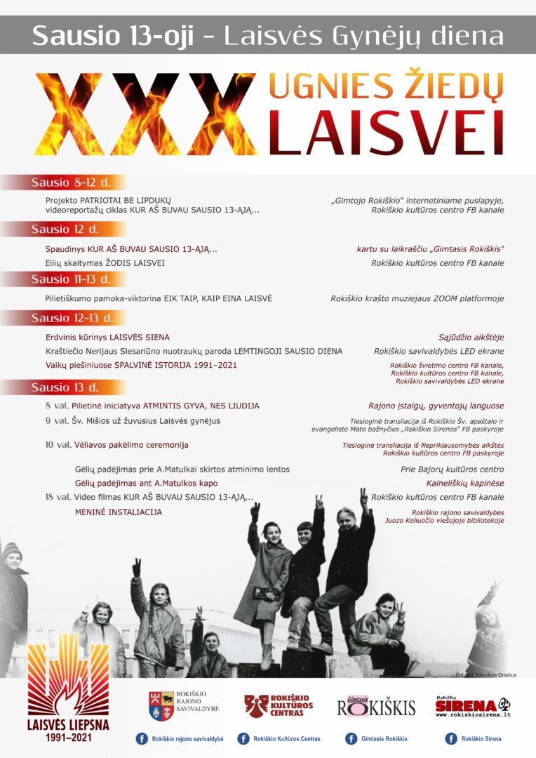 Spalvinė istorija 1991-2021 atgims vaikų piešiniuose – tai Rokiškio švietimo centro inicijuojama akcija, o Sąjūdžio aikštėje šviesa suspindės Rokiškio KC sukurtas erdvinis kūrinys Laisvės siena. Lemtingoji Sausio diena bus matoma Rokiškio rajono savivaldybės LED ekrane – tai kraštiečio Nerijaus Slesariūno, tos dienos jauno žmogaus foto pasakojimas – paroda.