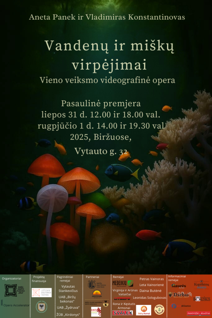 Videografinės operos „Vandenų ir miškų virpėjimai“ Pasaulinė premjera vyks liepos 31 d. 12 ir 14 val. bei rugpjūčio 1 d. 14 ir 19.30 val. Trukmė – 1 val. Spektaklio vieta – Biržų „Saulės“ gimnazijos sporto salė-angaras, Vytauto g. 32.