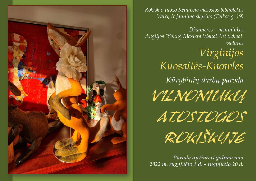 Menininkė V. Kuosaitė-Knowles atvyko į gimtinę atostogų ir nudžiugino Rokiškio vaikus bei suaugusiuosius rankų darbo originaliais darbais iš vilnos ir tekstilės. Tekstilinės skulptūros menas Virginijai nauja, dar mažai išbandyta, bet labai viliojanti sritis. Kūrybinių paslapčių menininkė sužinojo iš pasaulinio garso menininko-tekstilininko Mister Finch ir per palyginti trumpą laiką pati sukūrė gražų būrį spalvingų herojų, įvairių miško gyventojų, kuriais mes turime galimybę pasidžiaugti. Autorė pati ieško medžiagų, pati maketuoja, pati siuva ir apmezga savo herojus. Parodoje eksponuojami gerai visiems žinomi žvėrys, gyvenantys Vidutinių juostų miškų zonoje: lokys, vilkas, lapė, barsukas, ežys ir kiti. Menininkės Virginijos dėka jie įgavo naują savitą pavidalą, tapo jaukiais pasakų veikėjais.