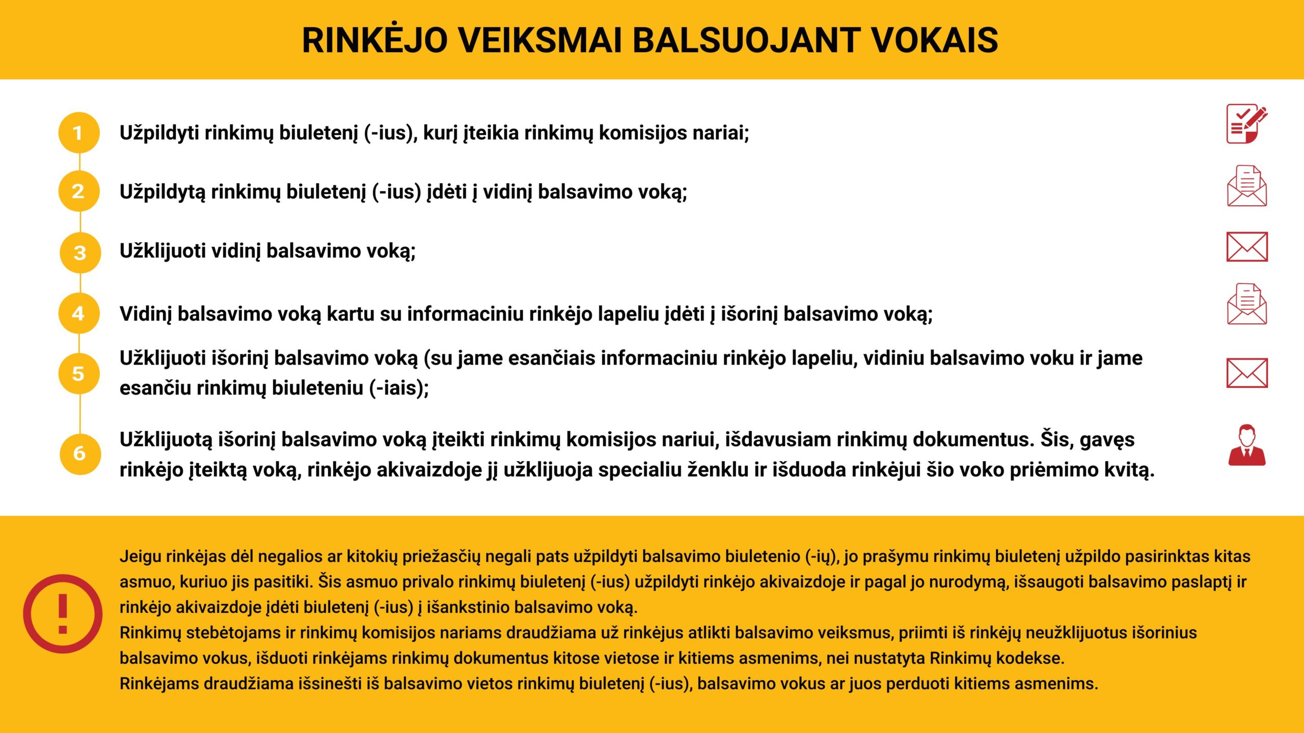 Spalio 11–12 dienomis rinkimų komisijų nariai organizuos balsavimą rinkėjų namuose. Balsuoti namuose gali rinkėjai su negalia, juos namuose slaugantys asmenys, dėl ligos nedarbingi žmonės ir rinkėjai, sulaukę 70 ir daugiau metų.