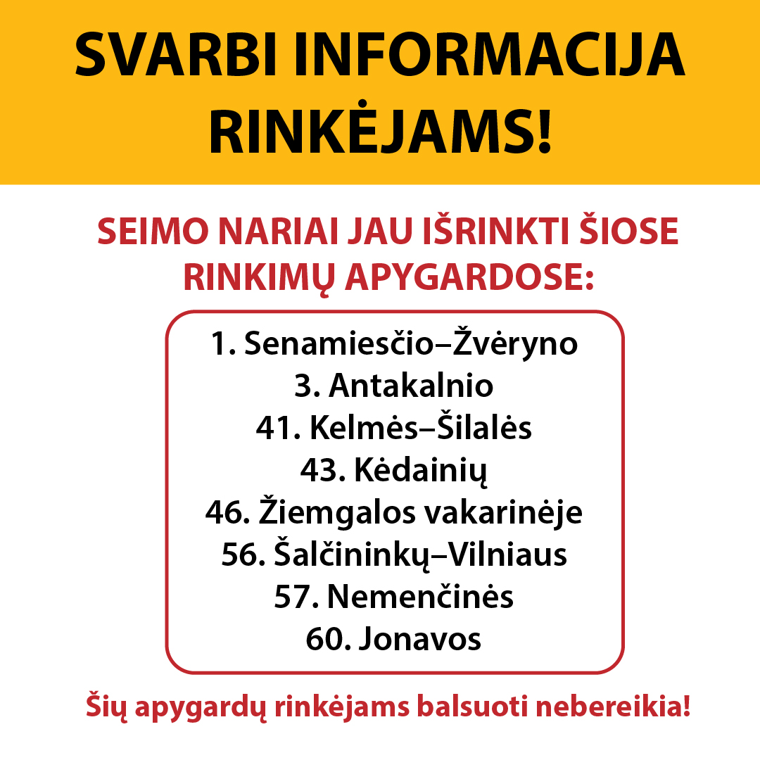 Svarbu žinoti, kad 8 rinkimų apygardose Seimo nariai jau yra išrinkti ir tų apygardų rinkėjams balsuoti nebereikia.