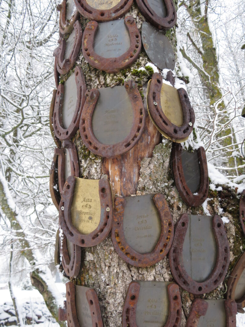 Žvalgantis po teritoriją, akis užkliūva už pasagomis dekoruotos skulptūros. „Pasagos viduryje pritvirtintoje metalinėje plokštelėje išgraviruojami besituokiančiųjų vardai. Vieną įteikiu porai, kita lieka man“, – vardina Bronius. Kiekvienos čia švenčiamos krikštynos įamžinamos šaukštuose – išgraviruojamas vaiko vardas ir šaukštas pakabinamas ant kelmo. Na, o paaugusius vaikus labiausiai domina čia auginamos dekoratyvinės vištos.