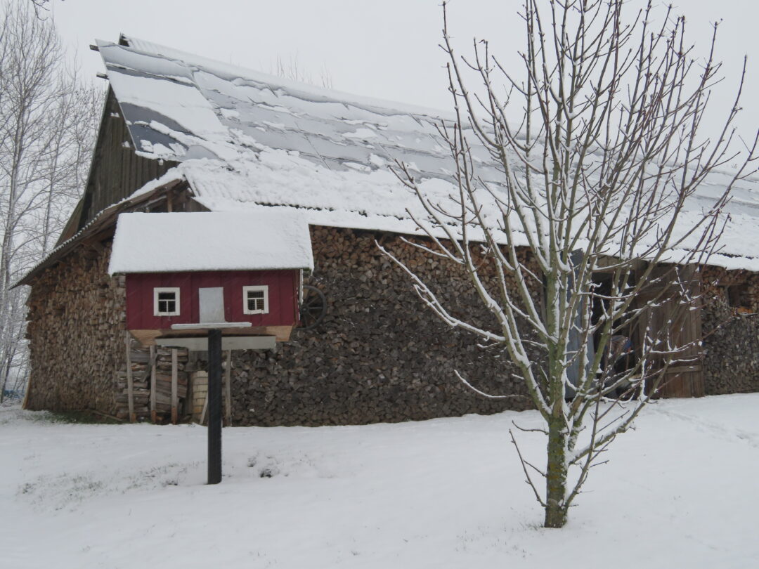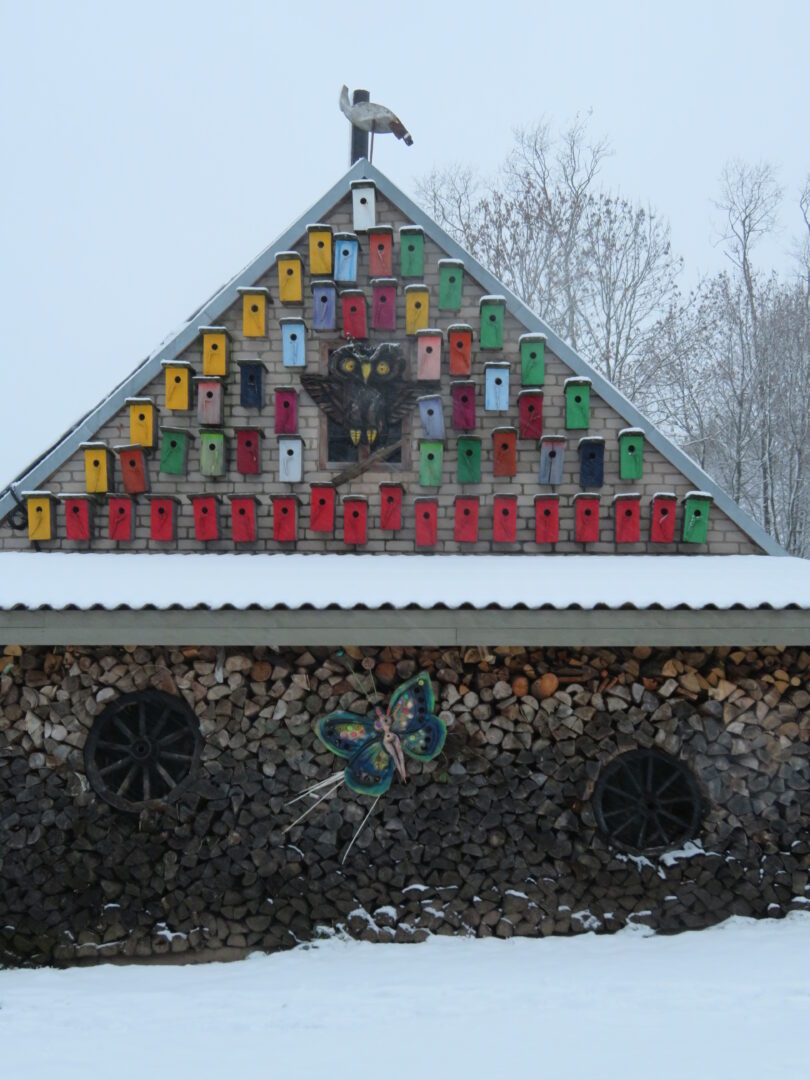 Ūkinių pastatų sienos užkrautos malkų eilėmis, kuriose įsprausti vežimų ratai. Iš tolo jie atrodo tarsi langai. Ir žiūrėti smagu, ir nuobodžios plytų sienos uždengiamos.