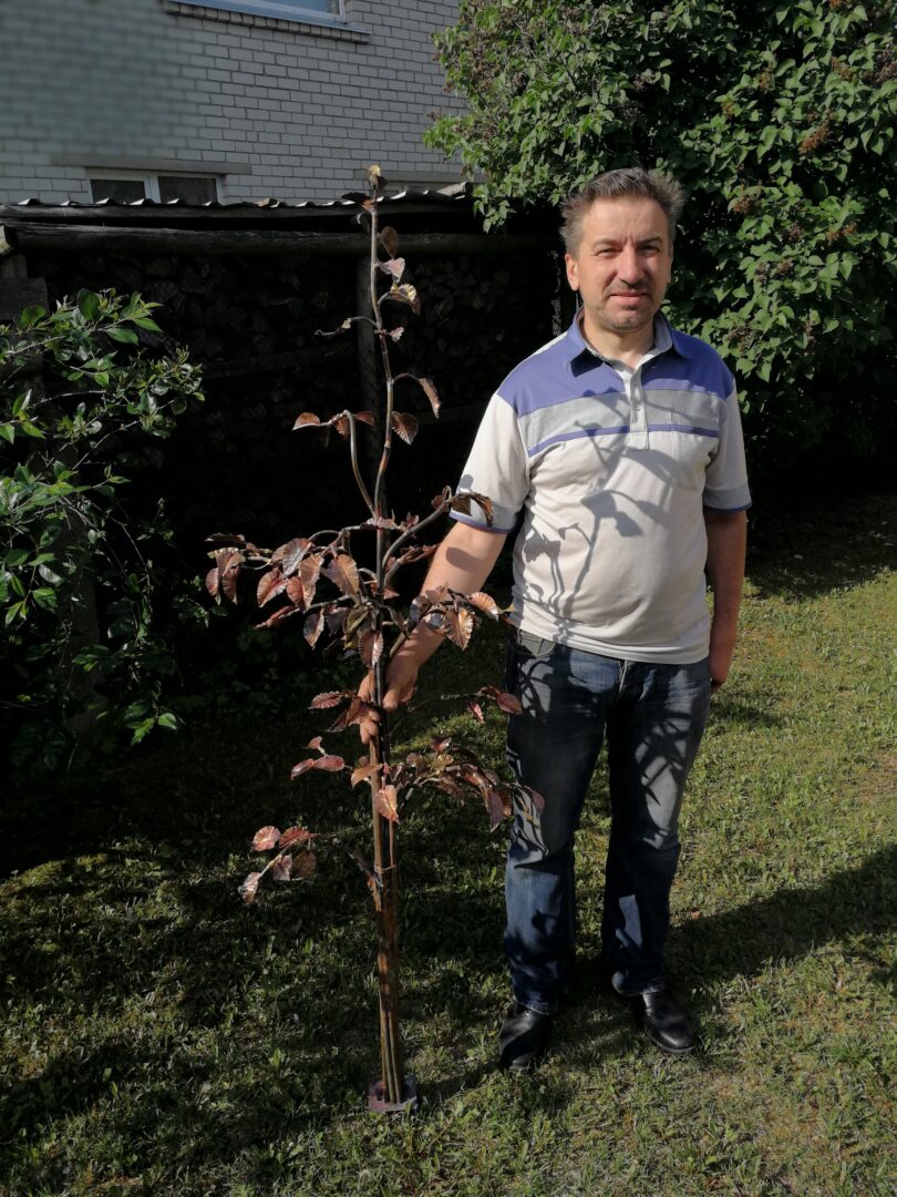 Šis kūrinys, pasak menininko, šimtaprocentinis rankų darbas (neskaičiuojant vamzdelių vandeniui tekėti). Vien obels lapelių teko nukaldinti daugiau nei du šimtus. Rankomis nukalta talpykla vandeniui sutekėti. Taip pat teko pamąstyti, kaip paslėpti vamzdelius, išspręsti kitus techninius dalykus. Kūrinys tonuotas, padengtas oksidine plėvele. „Jau seniai galvoje sukosi tokia mintis. Direktoriui (Gintarui Girštautui – aut. past.) pasiūliau, jis sutiko. Šis darbas – eksperimentas, nes fontano niekada nekūriau. Mėnesį prie jo sėdžiu, o galvoje jau sukasi kitas. Mano žiniomis, Lietuvoje panašaus pobūdžio įstaigose tokių darbų nėra, artimiausi – Vokietijoje ir Sankt Peterburge“, – pasakojo po savo stogu fontaną kuriantis menininkas.