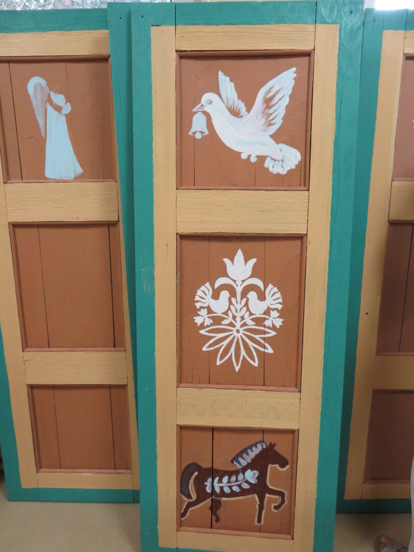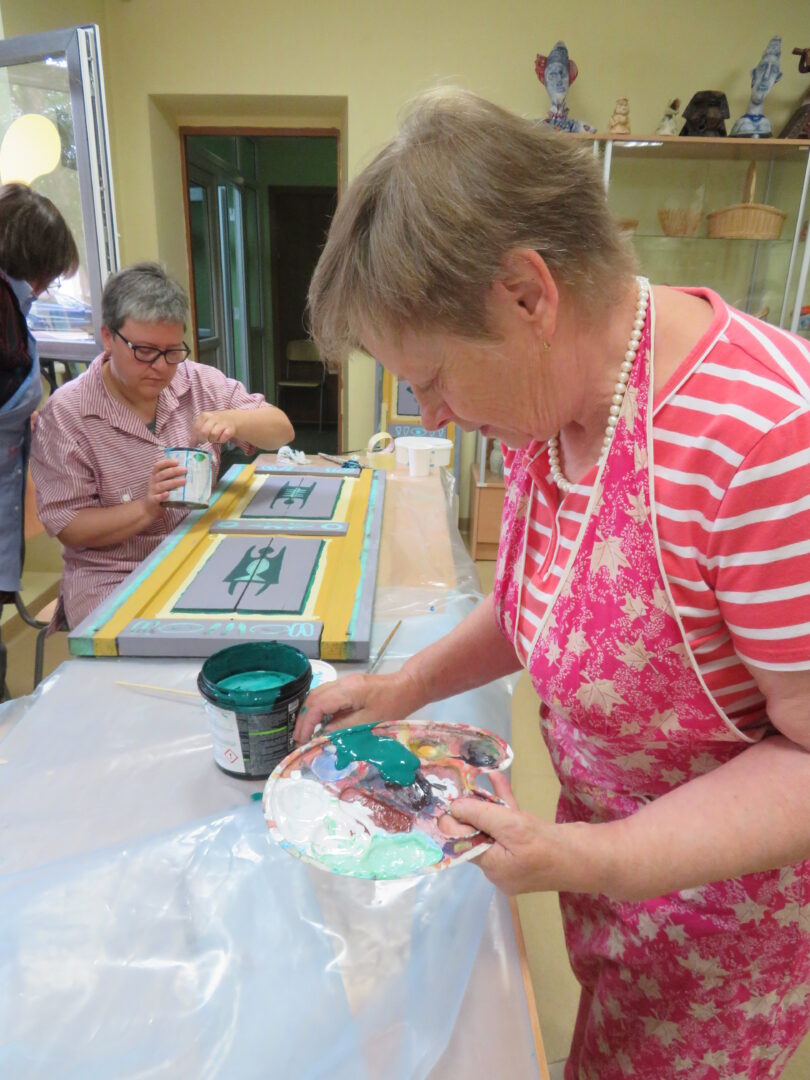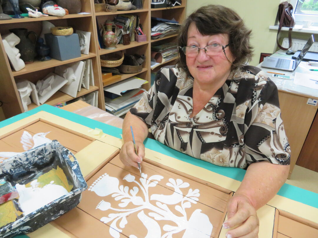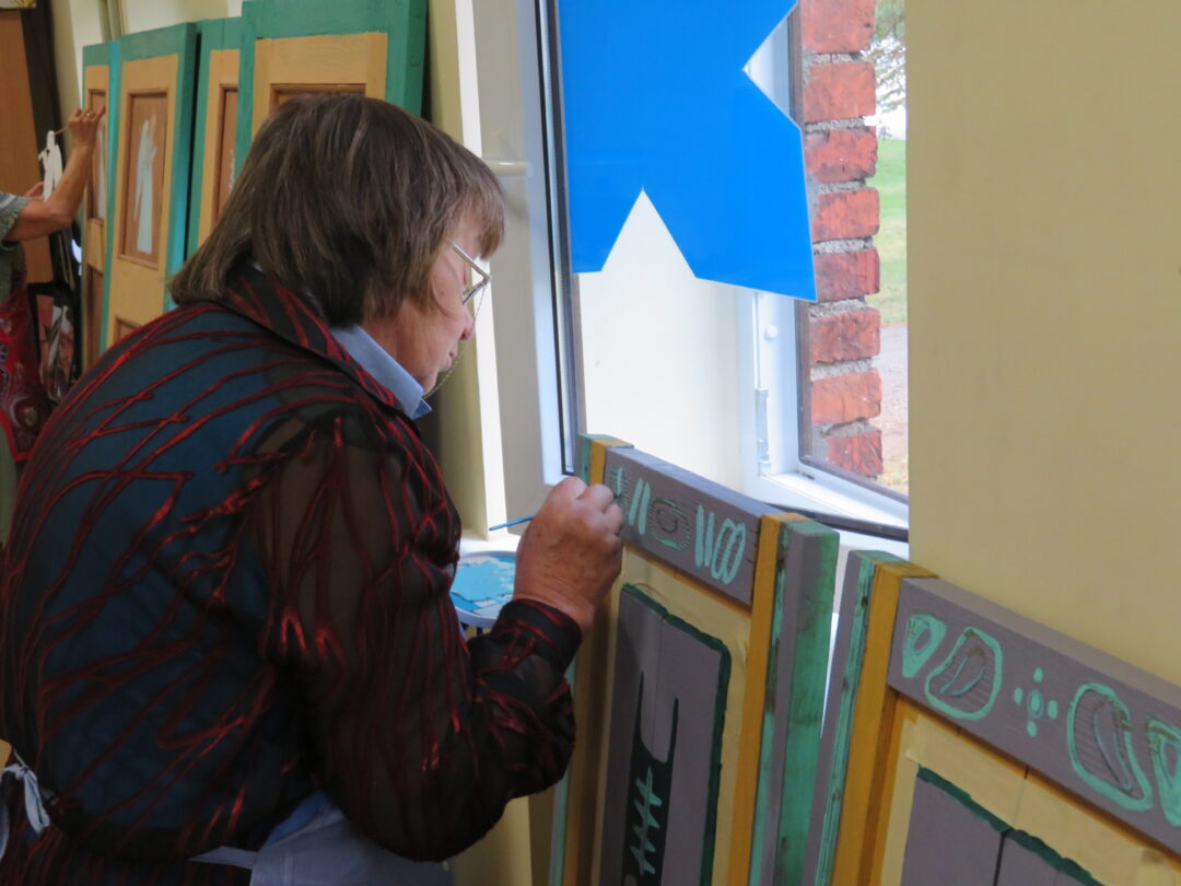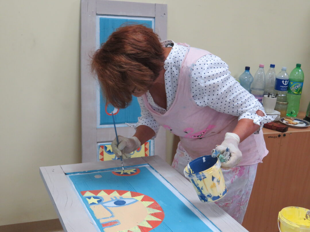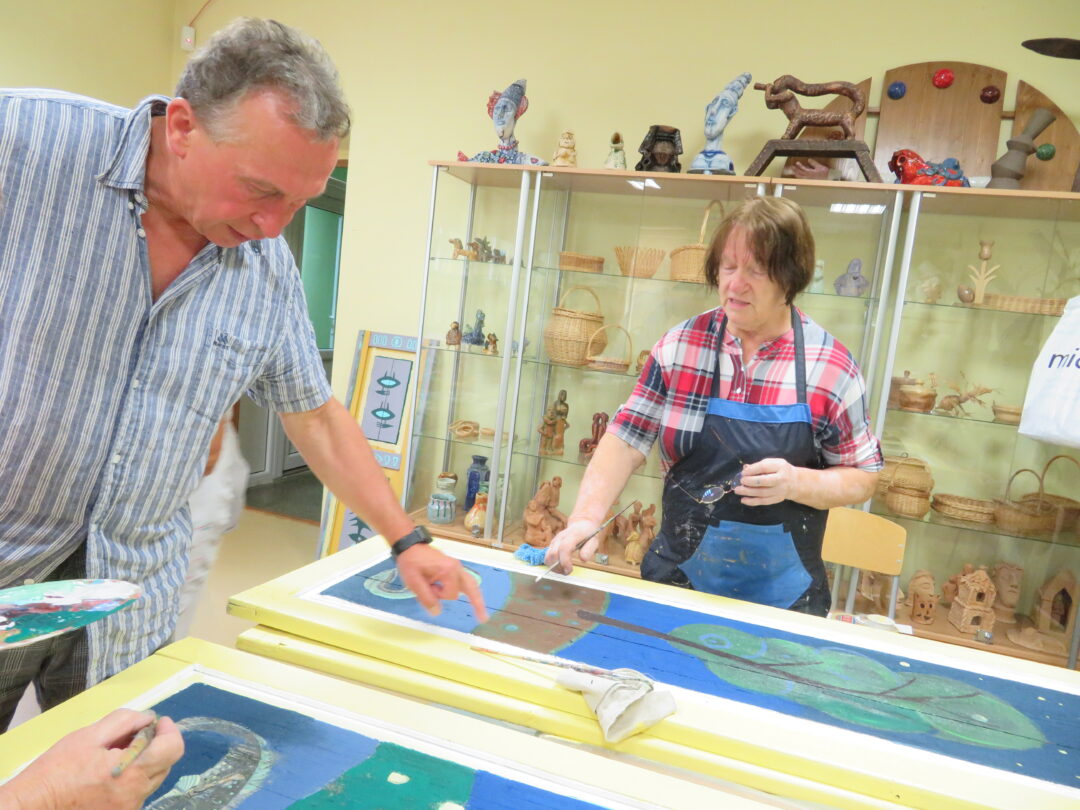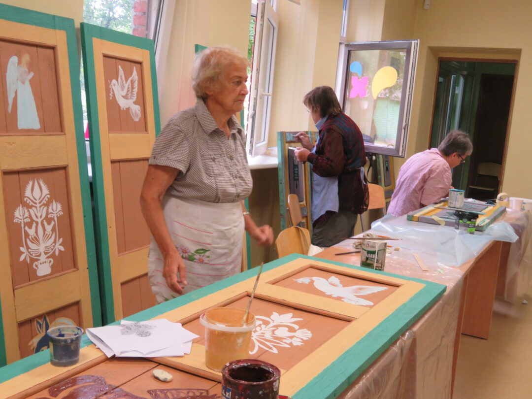 Iš tiesų tapybos studija virtusioje klasėje su teptukais rankose sukiojasi vien moterys. „Tai socialinis projektas, tai bandymas suteikti galimybę kūrybiškai pasireikšti ir galbūt pradėti darbinę veiklą… Dešimt dalyvių nebuvo sunku surasti, nes kone visos dalyvauja tautodailininkų veikloje, kai kurios įsijungusios ir į kitų organizacijų projektus, – pastebi dailininkas. – Šis projektas susideda iš dviejų dalių. Pirmoje dalyje vyksta dešimties dienų mokymai. Jų metu įgaunama teorinių žinių ir restauruojamos senos langinės. Dalyvės susipažįsta su kompozicija, su dažais, mokosi juos maišyti, atkurti spalvas… Kai kurios langinės labai nukentėjusios, kai kurias plokštumas reikėjo atnaujinti žiūrint į langinių katalogą.“ Atnaujinamos dešimties langų langinės.