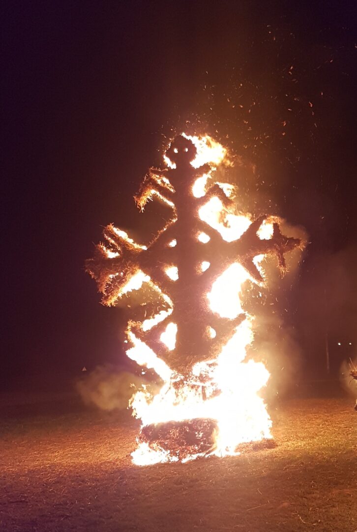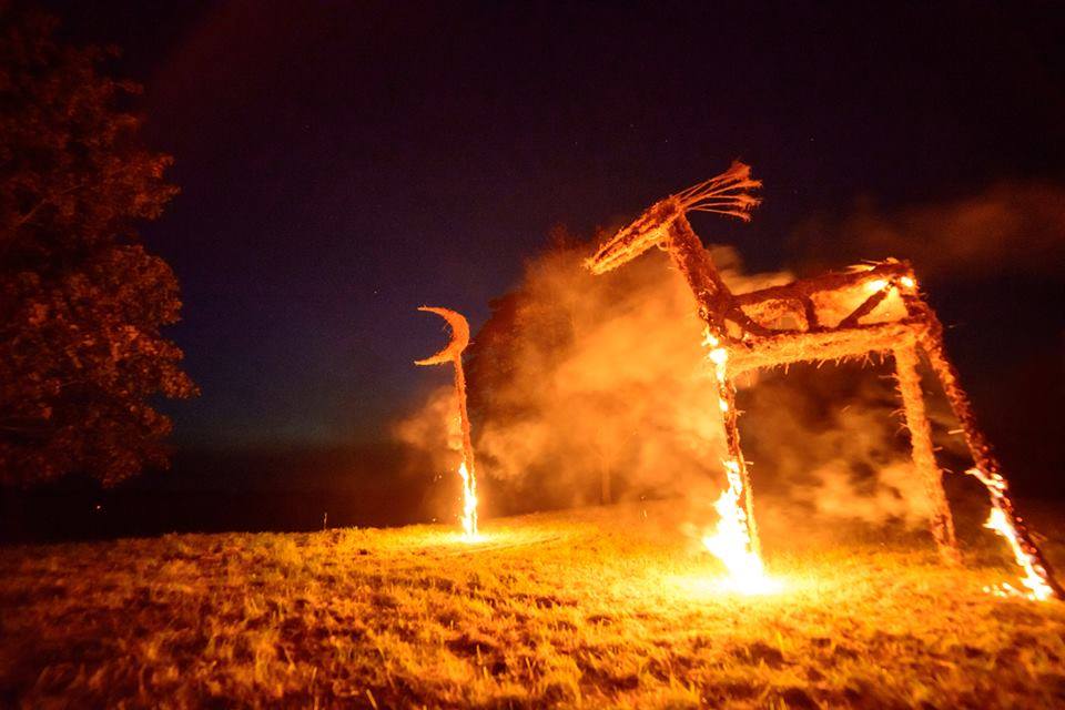 Įprasta matyti degančius laužus, rečiau suliepsnoja iš šiaudų ir šieno sukurtos skulptūros. Priklausomai nuo formos ir dydžio, oro sąlygų, jos liepsnoja 10–30 min. Jas ruošti įgudę menininkai teigia, kad vienos skulptūros sukūrimo laikas apytikriai gali svyruoti nuo 6 valandų iki 3 darbo dienų. Skulptūroms naudojami šiaudai, šienas, nendrės. Organizuojamos net ugnies skulptūrų šventės, simpoziumai.