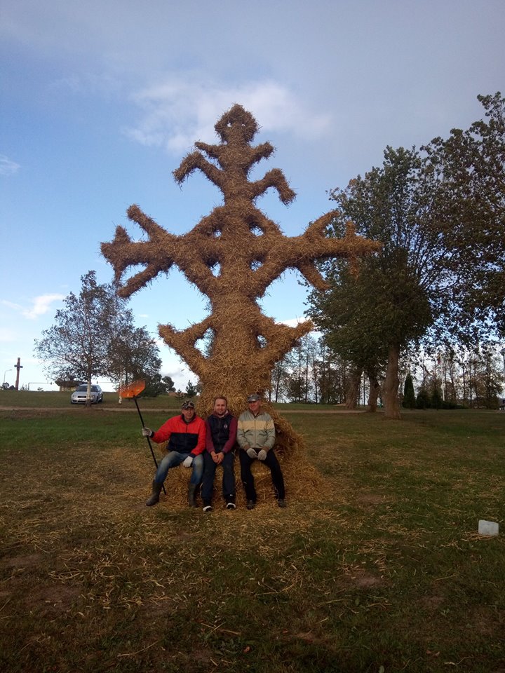 A. Ruželienė puikiai pamena, ką patyrė ją kurdama. Tokioms kompozicijoms prireikia ne tik išmonės ar žinių, bet ir fizinės jėgos. Jai pagelbėjo vyras – iš medžio surišo didelį karkasą. Prisidėjo ir dar viena pagalbininkė, tad šieną iš ritinio trise pynė, rišo, vyniojo… Tam sugaišo daug laiko. „Sugaištas laikas priklauso nuo įgūdžių. Man tai buvo pirmas kartas, todėl ilgai užtrukome. Jei darytum nuolat, žinotum, kas ir kaip. Norėjome, kad šienas stipriai, tvirtai būtų suveržtas. O jei palaidai suriši, tai degdamas kris, nebus vaizdo“, – pasakojo tautodailininkė.