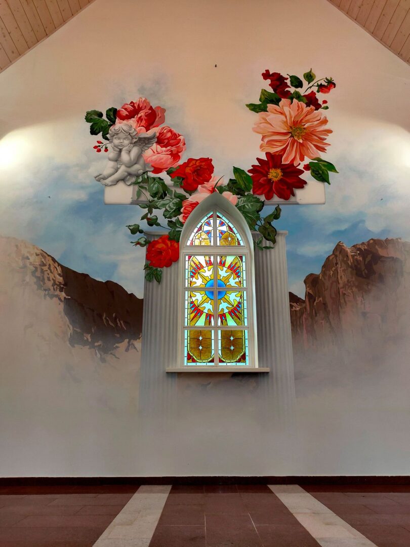- Spalvos – pilka ir žalsva. Šią spalvinę gamą galima matyti bažnyčios viduje (sienos).