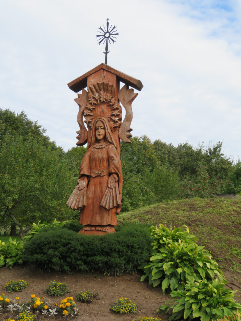 Šv. Antano skulptūrą, parimusią už koplyčios, G. Varnas sukūrė iš ąžuolo, kuris atgabentas iš Kupiškio rajono. Skulptūros aukštis siekia 3 metrus. Joje nemažai sudėtinių detalių, taigi teko atlikti daug montavimo darbų, kuriems naudoti labai kokybiški klijai ir dalims sujungti skirti varžtai. Kai kurios skulptūros dalys sujungtos mediniais kaiščiais.