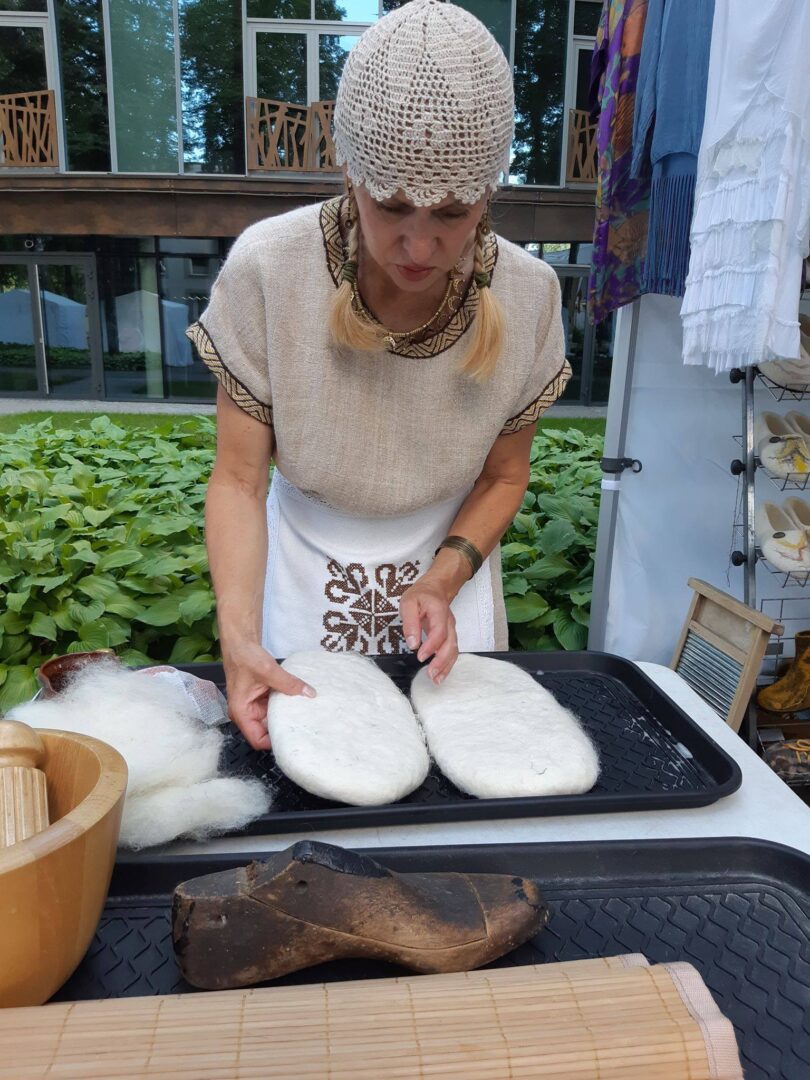 Veliant gaminius iš vilnos, tenka įdėti daug rankų darbo. Veliant šlapiuoju būdu, vilna susluoksniuojama, sudrėkinama muiluotu vandeniu ir glostoma, glostoma…Veltiniai ir šlepetės formuojamos ant kurpalio. O kaip formuojamos skrybėlės, juk jos turi atitinkamą išlenkimą, brylių? Pasirodo, reikia žinoti, kokia kryptimi kloti vilną, kad ji arba trauktųsi, arba plėstųsi. Tokiu būdu formuojami bryliai. Viršugalvis formuojamas medinės „galvos“ formos pagalba. Tačiau skrybėlių savininkų galvos, be abejo, skiriasi dydžiu, todėl Violeta skrybėlių viršų baigia suformuoti ant įvairiausių indų ir puodynių ir netgi savo pačios galvos.