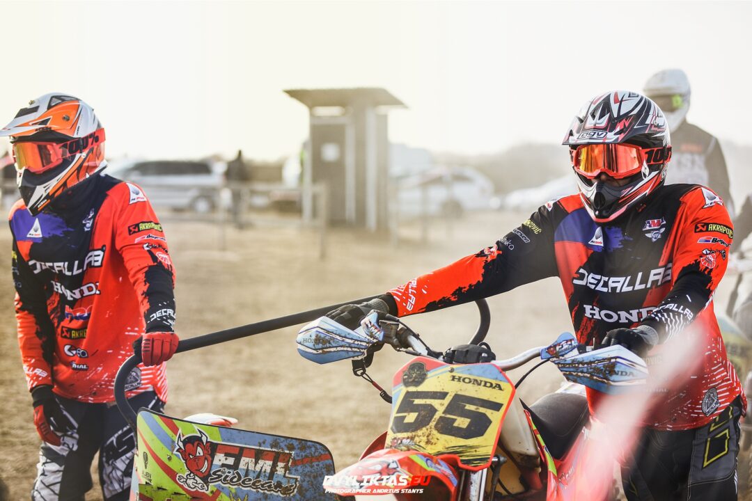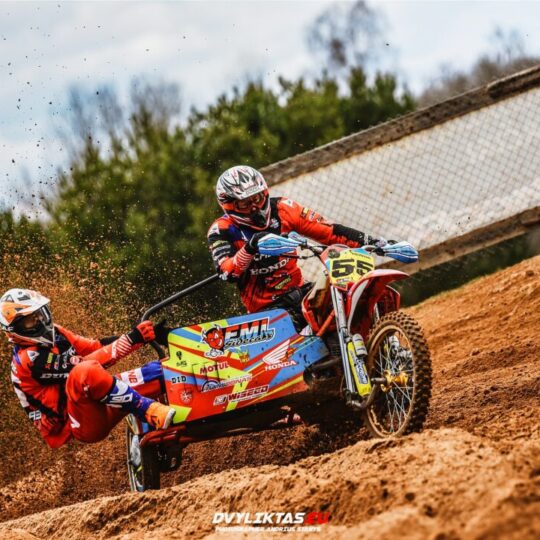 Domantas: – Pirmosiose varžybose dalyvavau 15-os. Keturračiu varžiausi porą sezonų, bet tada sugalvojome parduoti motociklus, skirtus trasoms, ir įsigyti skirtus važinėti keliais. Nuo tada beveik 10 metų į motokrosą važiuodavome tik kaip žiūrovai. Motociklas su priekaba atsirado netikėtai. Tėtis visada norėjo pabandyti važiuoti tokiu motociklu, bet vis nepasitaikydavo proga. Kartą, mums besikalbant, pagalvojau, kad ir aš norėčiau grįžti prie krosinio motociklo, nes pasiilgau trasos. Taip pat užsiminiau, kad smagu būtų išbandyti ir „kaleskę“. Tėtis šiai minčiai iškart pritarė.