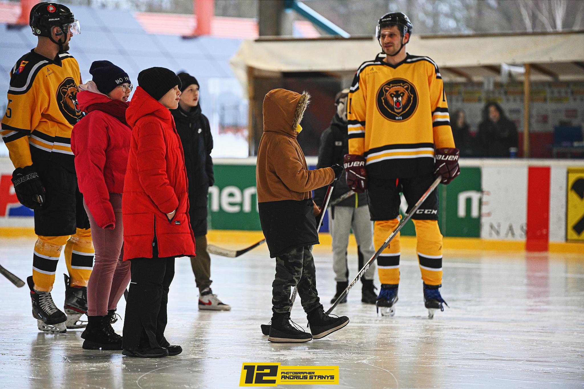 Pirmosios pertraukos metu į ledo areną buvo pakviesti vaikai. Jie rungėsi, kuris pataikys daugiau įvarčių į vartus, Nugalėtojas buvo apdovanotas „Grizlių“ marškinėliais, o visi norintieji galėjo vaišintis koše, verdama šalia arenos.