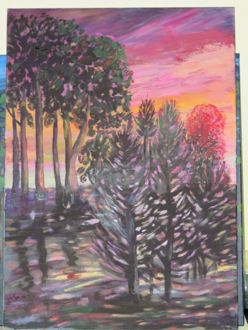 – Jį pavadinau „Ir nusinešė saulę miškai“. Pro mano virtuvės langą matosi vakarų pusė, sėdanti saulė. Dangus pasidaro toks raudonas, kad negali apsakyti. Tokį ir nutapiau.