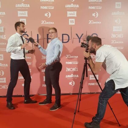 – Kalbu apie renginių vedimą. Pats tai dariau netrumpą laiką, o jis davė daug paprastų patarimų – kaip elgtis. Tas „renginių vedimas“ prasidėjo gimnazijoj nuo šimtadienio. Mes su Matu Valiuliu, tuomet vienuoliktokai, padarėm vestuvių muzikantų parodiją. Taip „padurniavom“ ir per išleistuves, dar kažkur ir… sulaukėm prašymo „vesti gimtadienį“. Tada, kai „paėjo gandas“, vieni per kitus kvietė. Mums Justas (Justinas Krisiūnas – režisierius – aut. past.) labai padėjo, jo daugybė darbo įdėta.