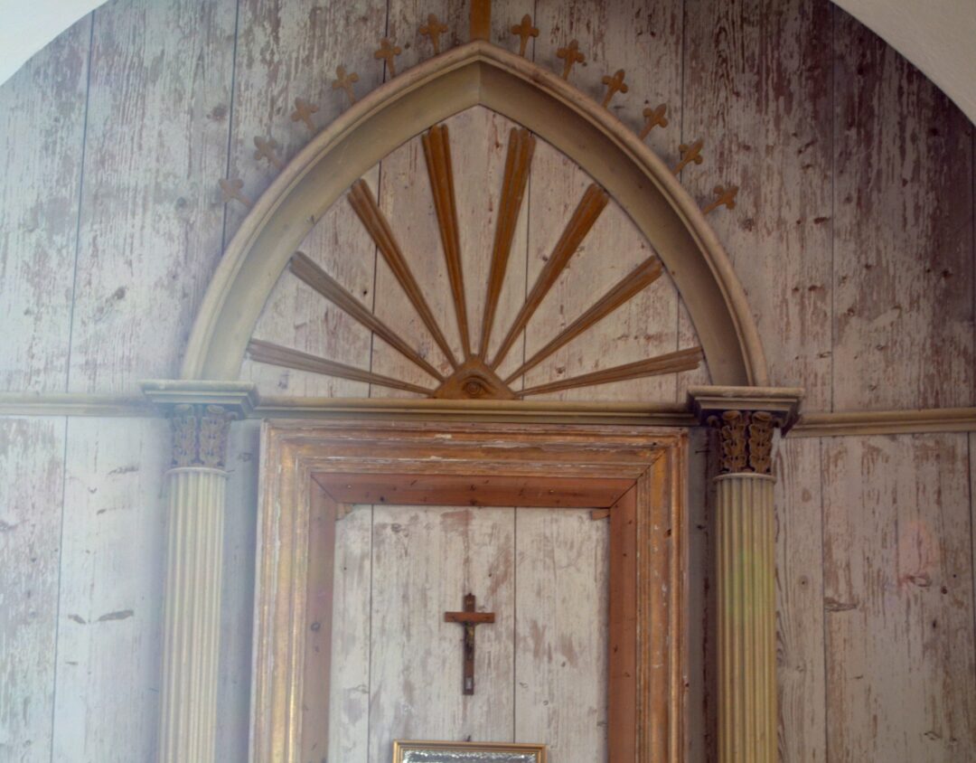 Altoriaus dešinėje, sienoje, yra aukštai iškirstas puslankis langas. Pro jį per pamaldas šnipas stebėdavęs, kuris tikinčiųjų neįmesdavo pinigėlio į aukų indą, ir apie tai dvasininkui pranešdavo. Šalia altoriaus kabo gerokai laiko paveikti geležiniai vainikai, kokie prieš pusę amžiaus dar buvo nešami į mirusio žmogaus šermenis ir Lietuvoje. Valentina sako, jog vainikai sudomino čia užklystančius istorijos tyrinėtojus, nes juose sukomponuoti kai kurie augalai įrašyti į Raudonąją knygą.