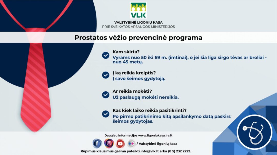 – Tam, kad liga būtų laiku pastebėta, labai kviečiu tikslinės grupės vyrus, sulaukusius 50-ies (iki 69 (imtinai), ar genetinės predispozicijos atveju – 45-erių (kai tėvui, broliui buvo diagnozuotas prostatos vėžys), periodiškai tikrintis sveikatą pagal prostatos vėžio ankstyvosios diagnostikos programą.