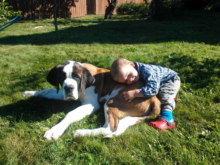 Kai įsigijome namus, pirmas pirkinys sau ir vaikams buvo šuo. Trumpaplaukį senbernarą su kilmės dokumentais pirkome iš „Vilnojos“ veislyno, jį pavadinome Harliu. Tūkstančio litų nepakako, bet norėjosi grynaveislio, nes jie neagresyvūs, išvesti gelbėti žmonėms, itin draugiški vaikams, tik labai seilėjasi ir gali su uodega parversti (juokiasi – aut. past.). Už kalės sukergimą iš vados mums atiteko Harlio sūnus, jį pavadinome Bruno. Tėčiui 6 metai, jis sveria 75–80 kg, sūnui 2 metai. Jų išlaikymas labai brangus, nes per parą reikia 1–2 kg sauso maisto, konservų ir stambių, mėsingų kaulų. Jų kailio kirpti netenka, tik pašukuoti, kai keičia plauką. Nors mėgsta būti šukuojami, tačiau neleidžia tvarkyti nagų. Tenka valyti ausis ir akis, nes užkritę akių vokai. Senbernarai laikomi voljere, tačiau vakare, kai uždaromi kiemo vartai, jie paleidžiami bėgioti po teritoriją. Dėl to nukenčia gėlynai ir daiktai, todėl kai kurių augalų teko atsisakyti, Brunas apkramtė vaikų žaislus. Virto net konteineriai. Jaučiamės saugūs, nes šunys sargūs, ant svetimų loja piktai, tačiau tikrai neapkandžiotų, jie pikti atrodo dėl savo dydžio. Vaikai su jais žaidžia. Yra nutikę kuriozinių atvejų – jaunas Bruno mėgdavo nueiti į kaimynės daržą ir gulėti tarpuvagyje, kol moteris ravi. Įsivaizduokite situaciją – šuo manęs neklauso, o ant rankų jo išnešti negaliu, nes nepakeliu… Su Harliu dalyvaudavome parodose Vilniuje. Ten jis traukdavo akį ir sulaukdavo komplimentų: „O! Bethovenas!“ Bet parodoms šunį reikia paruošti, o kol kas mano gyvenime viršų ima motinystė.