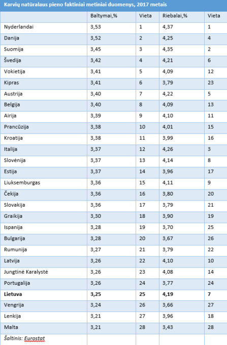 Tarp ES šalių Lietuva išsiskiria aukšto riebumo pienu, pagal šį rodiklį esame septintoje vietoje. Tačiau pagal baltymingumo rodiklius esame sąrašo pabaigoje (25 pozicija).