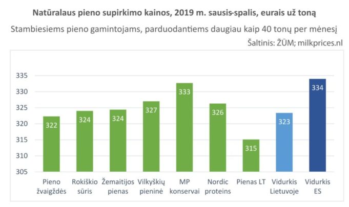 Tuo tarpu bendrai visiems ūkiams Lietuvoje per sausį-spalį vidutinė kaina už natūralų pieną siekė 285 eurus už toną.