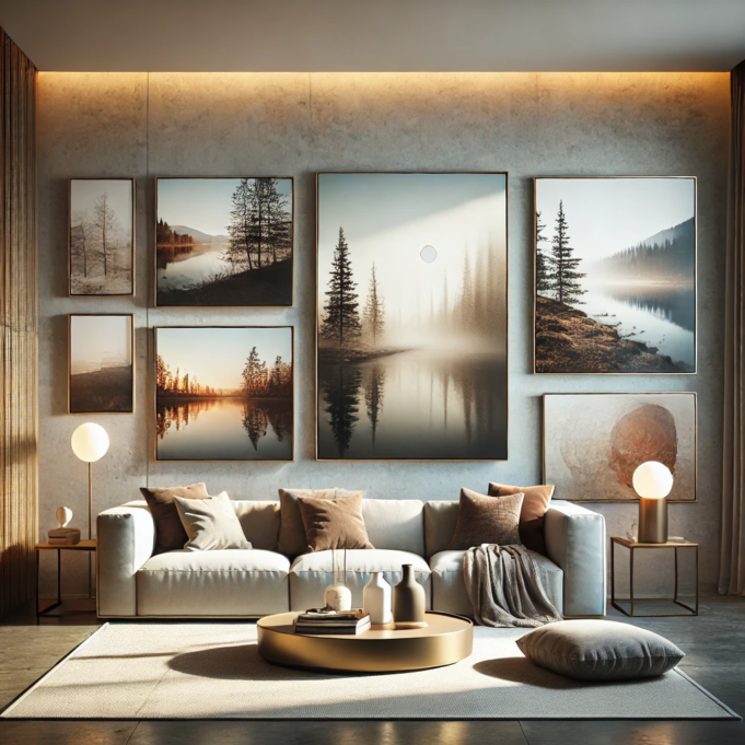 Simetriškas išdėstymas suteikia sienai tvarkos ir harmonijos. Pavyzdžiui, galite išdėstyti keturis vienodo dydžio paveikslus kvadratu arba tiesia linija. Toks išdėstymas ypač tinka minimalistiniame interjere, kur svarbi kiekviena detalė. Simetrija padeda sukurti struktūruotą ir elegantišką vaizdą, kuris vizualiai ramina ir suteikia erdvei pusiausvyros.