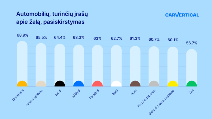 Iš visų Lietuvoje „carVertical“ tikrintų automobilių daugiausia įrašų apie apgadinimus eismo įvykiuose turėjo oranžiniai automobiliai (68,9 proc.) ir smėlio spalvos modeliai (65,5 proc.).