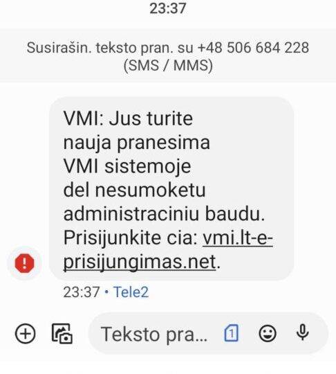 Sukčiai siunčia SMS žinutes, kuriose nurodoma, kad Jums rašo VMI: jūs turite naują pranešimą dėl nesumokėtų administracinių baudų, ir nurodoma prisijungimo nuoroda. Paspaudus ant nuorodos būsite nukelti į puslapį, kuris atrodo išties kaip tikras VMI puslapis. Netikrumą išduoda keletas detalių: originalus VMI puslapis siūlo daugiau prisijungimo būdų per išorines sistemas nei sukčių, taip pat sukčių puslapyje neveikia prisijungimas nei su VMI priemonėmis, nei su el. parašu (šios parinktys neaktyvios).
