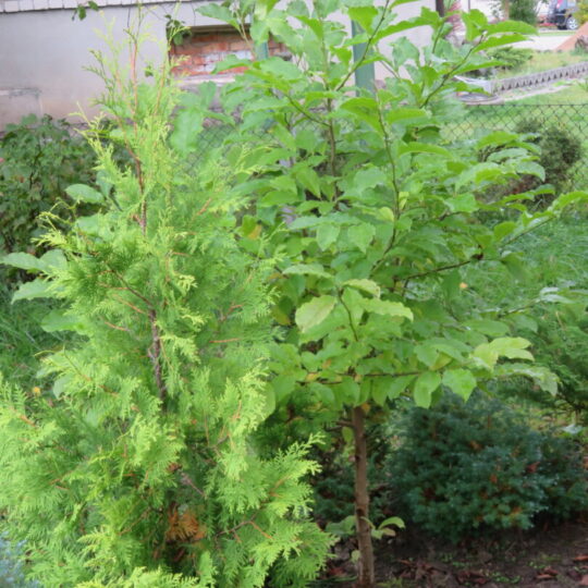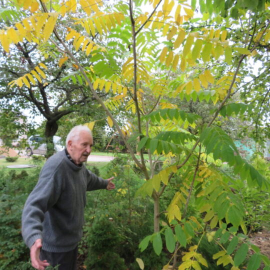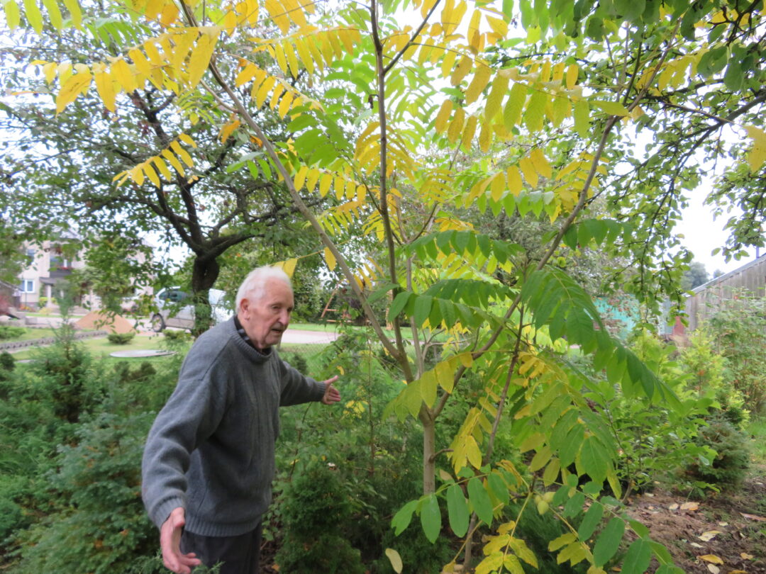 Už šeimininką gerokai didesnis ir riešutmedis. Jis, kaip ir gerokai žemesni gentainiai, dovanojamas. Pasak J. Barisos, šie medeliai labai tiktų parkams. Po jais glaudžiasi sodo klasika – diemedžių kelmeliai.