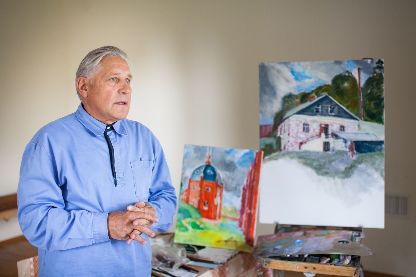 Patyręs insultą, vasarą praleidau ligoninėse. Dabar mankštinuosi, stengiuosi greičiau įgyti formą, kad vėl galėčiau daugiau valandų būti prie molberto, pasiruošti suplanuotoms parodoms Vilniuje ir gimtajame Rokiškyje. Beje, studijoje, kai įsitraukiu į darbą, jaučiuosi gerokai jaunesnis ir sveikesnis.