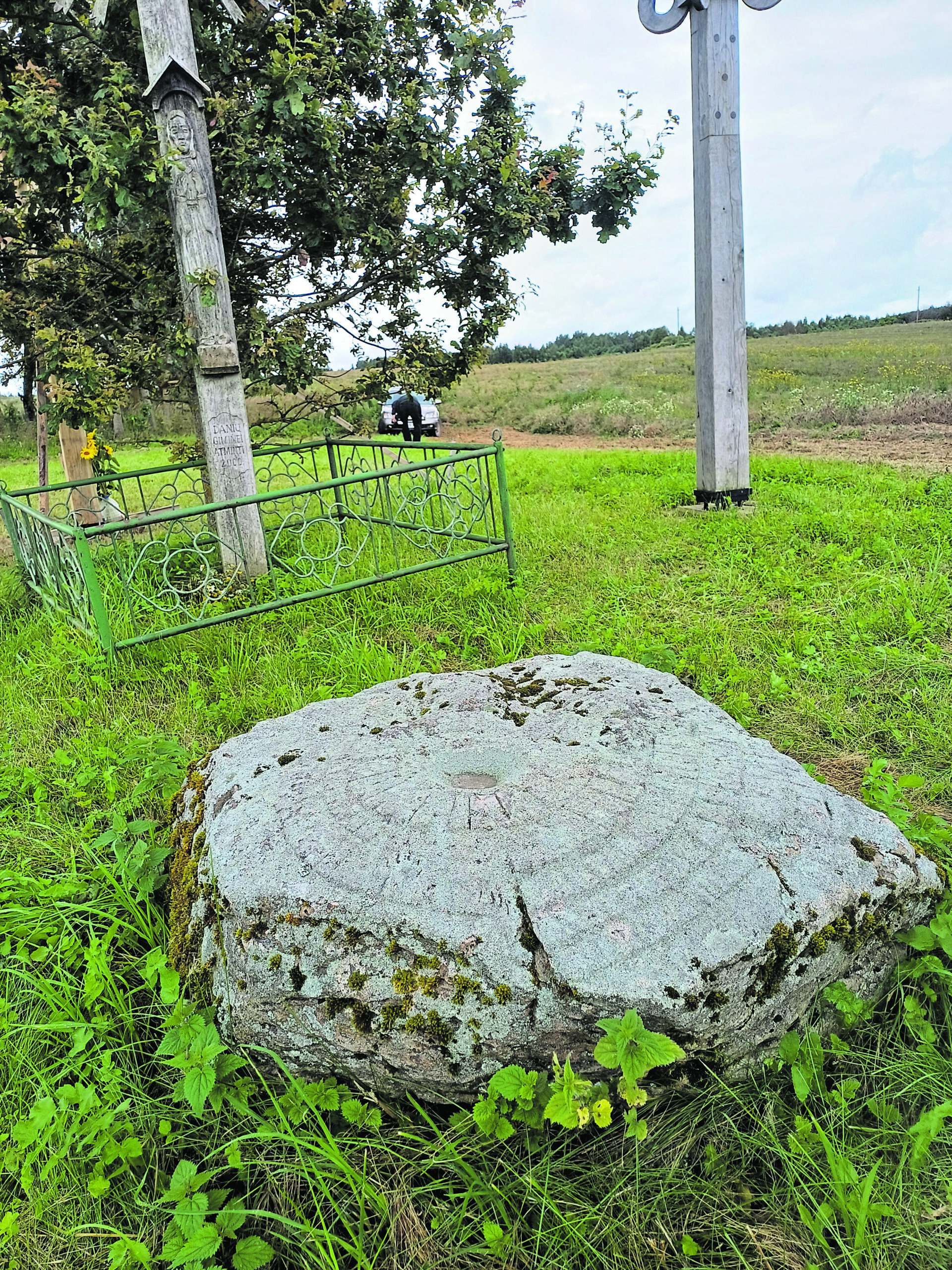 – Čia mano senelio Alfonso Danio 2000-aisiais statytas kryžius. Jis pirmas atsirado. Čia, šitoj vietoj, buvo jų sodyba, statyta apie 1910 metus. Apie 1935 metus ji sudegė ir paskui buvo atstatyta. Po karo šitoj sodyboj buvo kolūkio kontora, paskui pradinė keturklasė mokykla. 1975 metais teritoriją numelioravo ir sodybos neliko. Ir ne tik šitos sodybos. Čia aplinkui buvo gana tankiai gyvenama – sodyba prie sodybos. Netoliese gyveno kunigas, tai buvo laikoma kone šventa vieta. Šalia tekėjo upelis, buvo durpynai, kur dirbo žmonės, ten matosi senosios kapinaitės, kuriose palaidotas mano prosenelis, kuris čia įsikūrė, pasistatė tą sodybą.