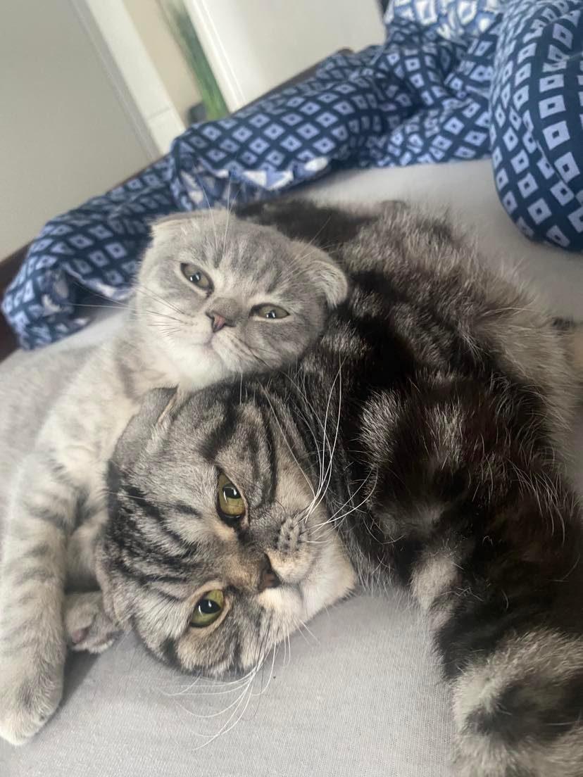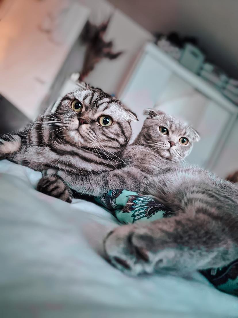 Niekada negalvojau, kad auginsiu kačiuką, o dabar turiu net du škotų nulėpausius Simbą ir Lokį. Buvau šunų mylėtoja ir visada galvodavau, kad ateityje auginsiu tik šunį, tačiau dar gyvendama Utenoje ir planuodama persikraustymą į kitą butą pagalvodavau apie gyvūną. Tačiau šuniui bute reikia erdvės, o mažo nesinorėjo, tad susimąsčiau apie katiną kaip iš reklamos, pilkai juodą, rainą ir nulėpusiomis ausytėmis. Vieną dieną grįžusi po darbo pavargusi peržiūrėjau skelbimus ir radau katytę mieste, į kurį kaip tik ketinau važiuoti po kelių dienų. Taip pas mane atsirado pirmoji katytė Simba. Kai ji paaugo, pakeičiau jos seną draskyklę į didesnę, su keliais gultais ir stebėdama ją savo „soste“ pagalvojau, kad čia puikiai tilptų dar vienas. Taip atsirado Lokis. Kadangi pirmoji dama yra charakteringa, bijojau, kad gali kilti nesklandumų, tad gyvūnus teko laikyti atskiruose kambariuose kelias dienas. Pasiėmiau net savaitę „mamadienių“ vien tam, kad po truputį suleisčiau juos kartu ir ramiai keliaučiau į darbą.