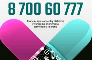 Telefono numeriu 8 700 60 777 galima pranešti apie žinomus narkotikų platinimo atvejus. Telefono linija veikia darbo dienomis nuo 7 val. iki 20 val.