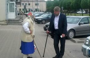 Pagal patarlę: "Niekada neišsižadėk lazdos ir terbos...". Ona Makarskienė iš Kairelių ir rajono meras Antanas Vagonis. Lazda pasiramsčiuodama 81 metų senolė trečiadienį per pietus...