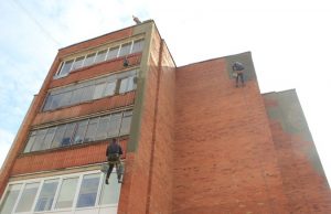 Aukštaičių g. 7-ojo daugiabučio gyventojams – neįprasta atrakcija: žmonės su siaubu dairosi į per sienas virvėmis besikarstančius aukštalipius, remontuojančius fasado aptrupėjusių raudonų plytų sienas....