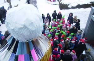Vieną žiemos rytą Rokiškio r. Bajorų kaimo kultūros centro kieme esančią rekordinę ,,Didžiausią su bumbulu žieminę kepurę” aplankė vaikai.